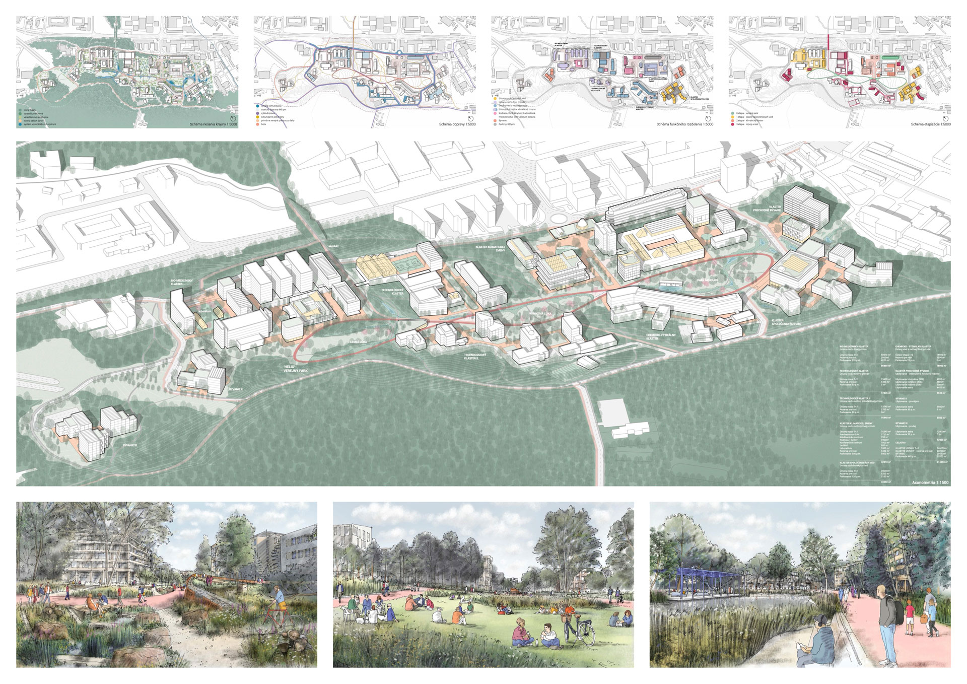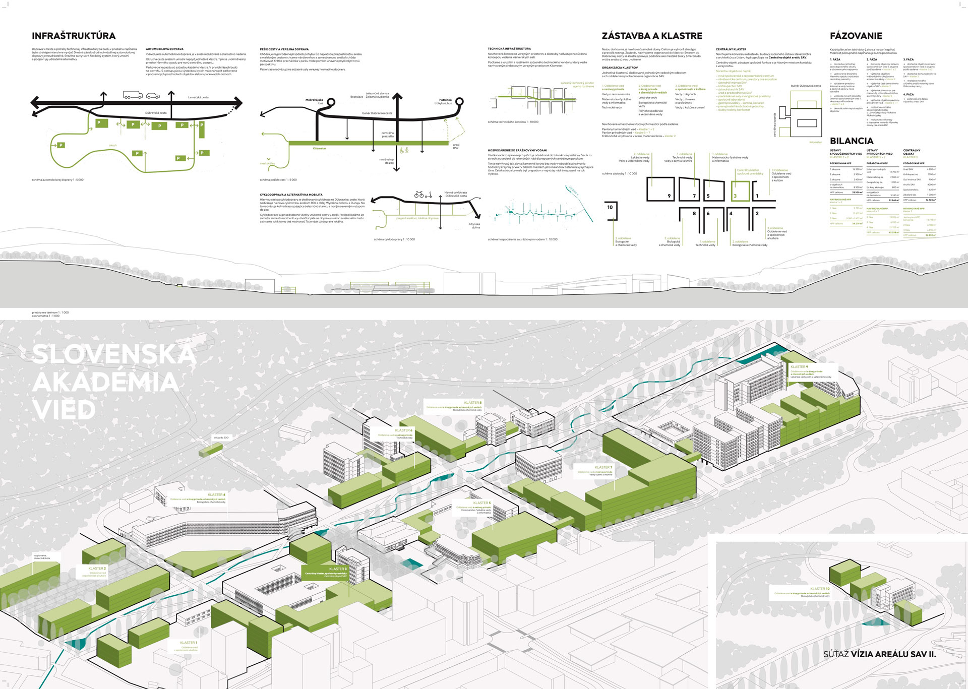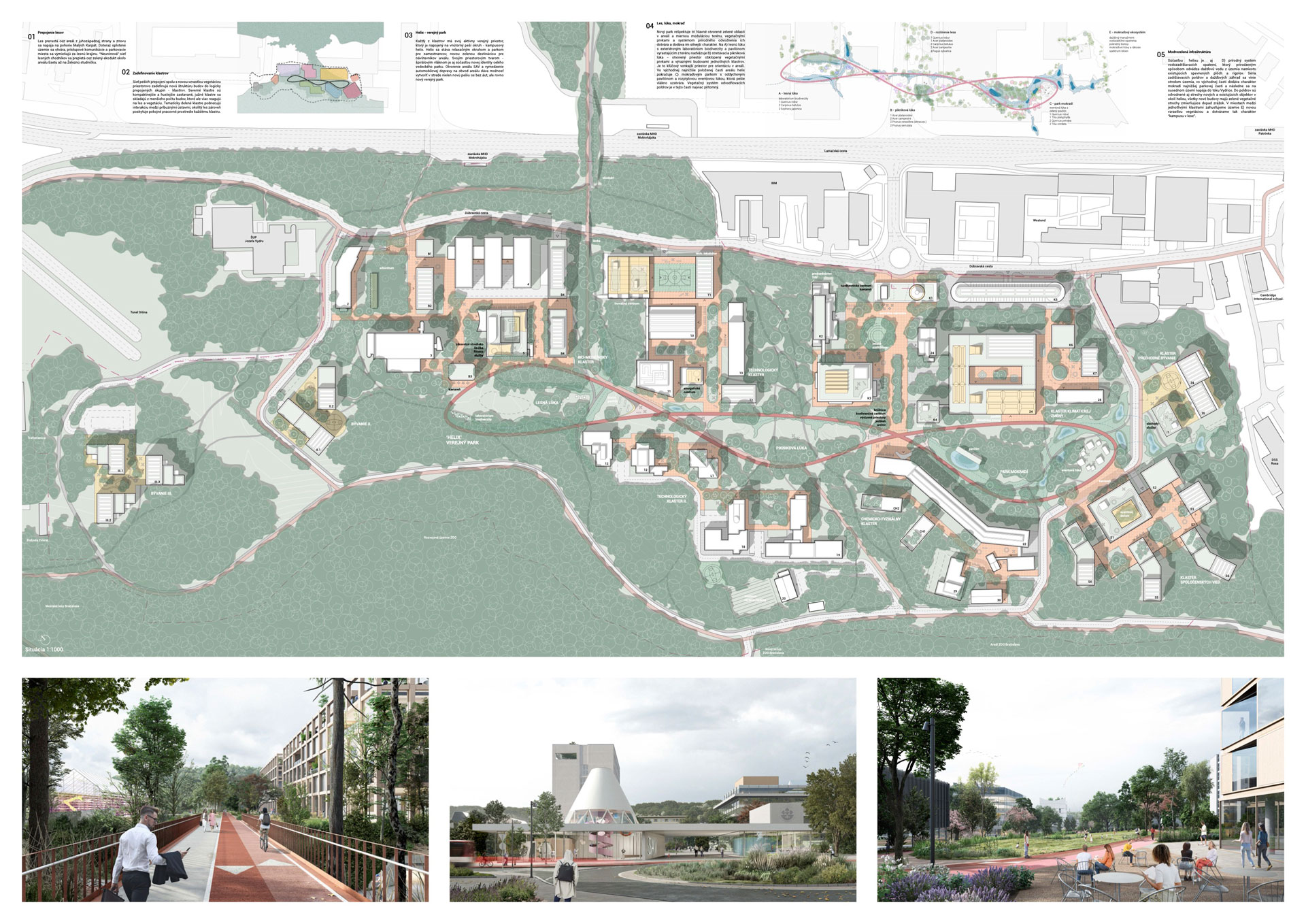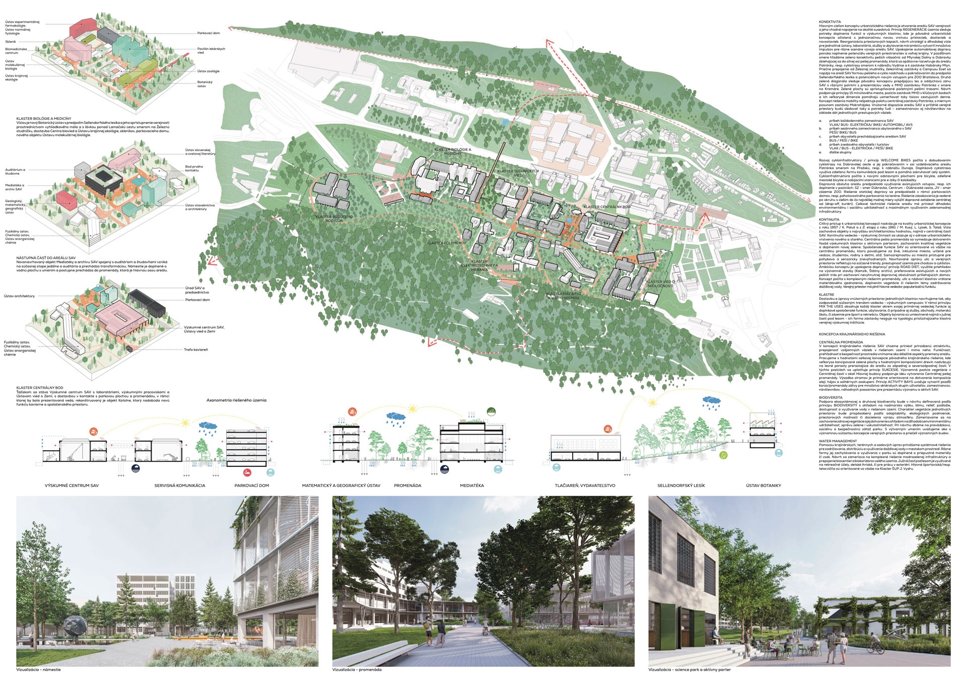 Porota oceňuje jasnú koncepciu návrhu, ktorý je založený na dvoch kľúčových ideách organizácie areálu v zmysle klastrov, ktoré reagujú na vedné zameranie pracovísk SAV a ústredného verejného parku Helix. Táto koncepcia podporuje vzájomnú interakciu a zakladá tak nové možnosti fungovania vedeckej komunity. Areál je koncipovaný ako otvorená krajina plynule nadväzujúca na dva silné prírodné celky v podobe zalesnených výbežkov masívov Malých Karpát. Verejný park Helix transformuje dopravne zaťažený priestor a je silným iniciačným momentom nového systému organizácie pohybu v areáli. Dáva jasný signál zmeny životného prostredia pracovníkov a návštevníkov areálu SAV. Ponúka atraktívne diverzifikované prírodné prostredie, ktoré tvorí náprotivok koncentrovanej zástavby klastrov. Jednotlivé klastre sa rozvíjajú okolo existujúcich objektov, najhodnotnejších architektúr areálu, pričom logicky nadväzujú na ich aktuálne funkčné využitie. Výnimkou je len klaster spoločenských vied situovaný na mieste pôvodnej zástavby na juhovýchode areálu. Existujúci hlavný nástup do areálu je v návrhu transformovaný do podoby reprezentačného vstupu, na ktorý nadväzuje klaster klimatickej zmeny. Ten zahŕňa všetky kľúčové spoločenské a riadiace zložky SAV.
