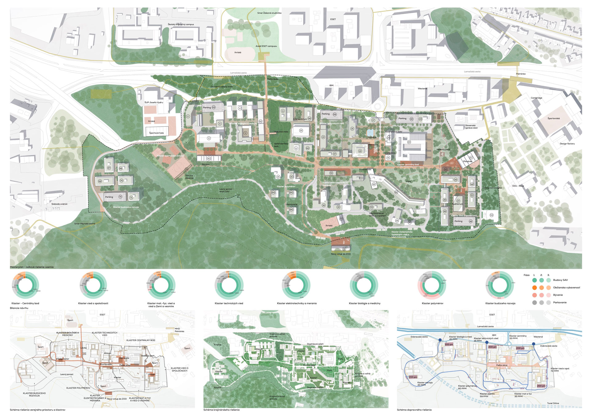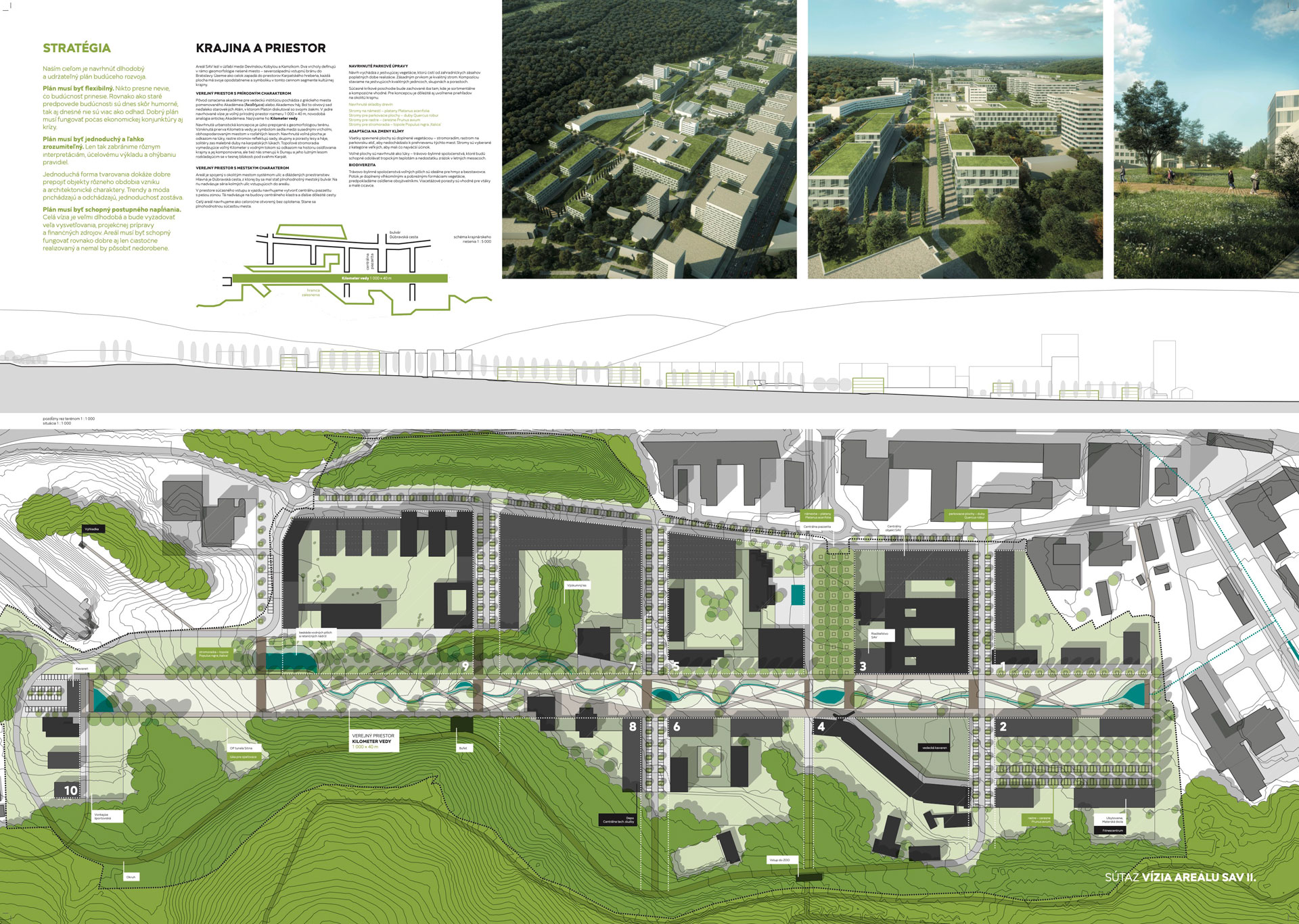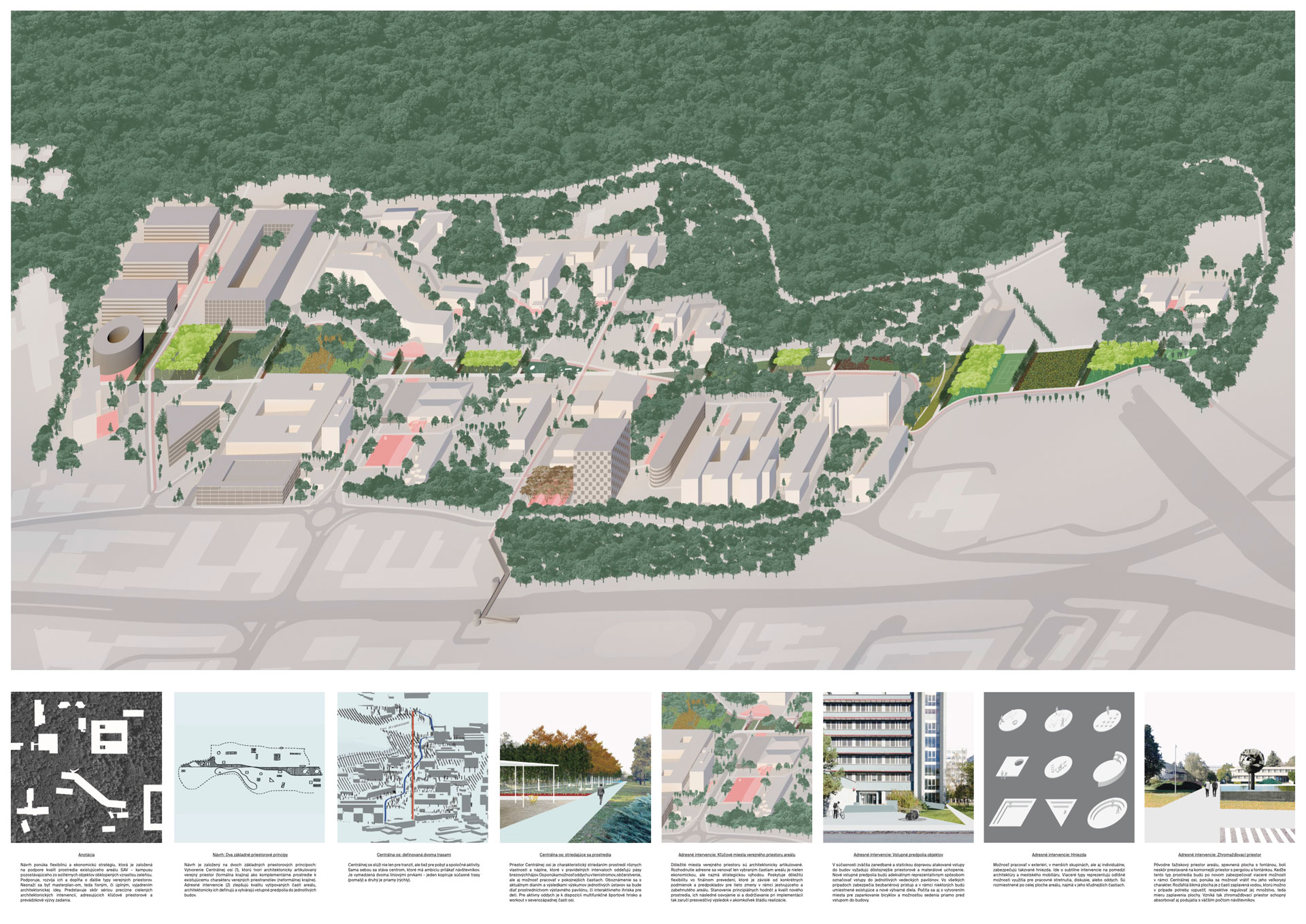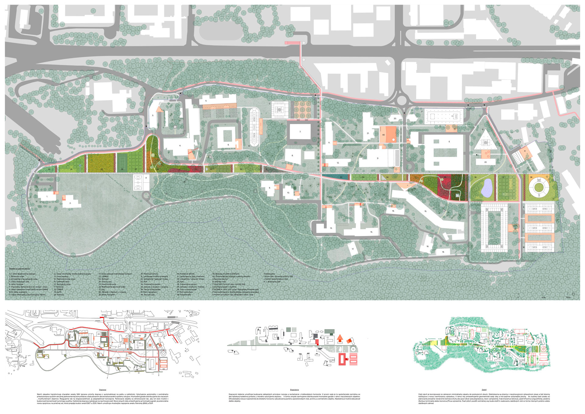 Celkové urbanistické riešenie je založené na silnom lineárnom prvku – osi, ktorá pretína areál SAV v pozdĺžnom smere a zároveň na rešpektovaní existujúcej hodnotnej architektúry a dopĺňaní urbanistickej štruktúry prevažne solitérnymi objektami – jednotlivými pavilónmi. Na os nadväzujú verejné priestory usporiadané v „mriežke“. Jednotlivé časti mriežky ponúkajú rôzne typy náplne, pobytovej kvality či druhu vegetácie, zároveň sú predelené riadkovou výsadbou stromov.