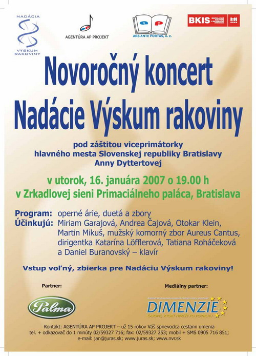 Nadácia Výskum rakoviny (vznikla v roku 1993) sa už tradične chce poďakovať svojim podporovateľom a spolupracovníkom za partnerstvo v uplynulom roku hodnotným kultúrnym programom. Po organovom koncerte na Bratislavskom hrade (Ján Vladimír Michalko, František Kovár, 2005) a bravúrnom uvedení Bachových klavírnych diel Mikim Škutom (Zrkadlová sieň Primaciálneho paláce, 2006) to bude tentoraz operný koncert mladých spevákov, ktorí už úspešne reprezentujú vynikajúcu slovenskú opernú spevácku školu. Na koncerte zaznejú slávne árie, dvojspevy a zbory z opier Don Giovanni, Čarovná flauta, Tanhäuser, Nápoj lásky, Bohéma, Nabucco, Rigoletto, Traviata a ďalších.