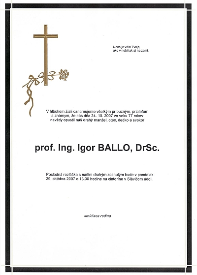Posledná rozlúčka s prof. Igorom Ballom bude v pondelok 29. októbra o 13.00 hod. na cintoríne v Slávičom údolí v Bratislave.