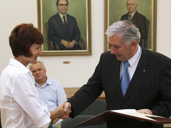 Čestnú plaketu SAV prevzala od prof. Štefana Lubyho samostatná vedecká pracovníčka Andrea Lauková z Ústavu fyziológie hospodárskych zvierat SAV, ktorú jej udelilo Predsedníctvo SAV pri príležitosti životného jubilea za zásluhy v biologických vedách.
