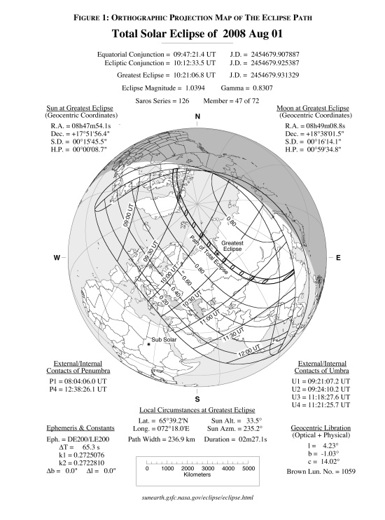 Dňa 1. augusta 2008 nastane po viac ako dvojročnej pauze úplné zatmenie Slnka Mesiacom. Úkaz pri ktorom Mesiac pri svojom pohybe okolo Zeme v maximálnej fáze celkom zakryje Slnko, sa začne pri východe Slnka pri brehoch Severnej Kanady o 09.21 h UT (Universal Time - svetový čas) a rýchlosťou asi 0,6 km za sekundu sa vydá na sever. Zachytí severné oblasti Grónska, prekĺzne pomedzi ostrovy Zeme Františka Jozefa a Svalbard, Novú Zem a na poloostrove Jamal zachytí pevninu Ruskej federácie. Maximálna dĺžka zatmenia, ktorá potrvá 2 minúty a 27 sekúnd, nastane presne o 10.21.07 h UT v mieste so súradnicami 65 stupňov 39 minút severnej šírky a 72 stupňov 18 minút východnej dĺžky na severe Ruska. V tom čase bude stred mesačného tieňa prechádzať najbližšie k stredu Zeme. Výška Slnka nad obzorom v tom čase bude 34 stupňov a šírka mesačného tieňa 237 km. Úplný mesačný tieň prejde cez územie Kazachstana, Ruska a cez pohorie Altaj do Mongolska a Číny, kde sa pri západe Slnka úplne zatmenie skončí. Mesačný tieň opustí povrch Zeme o 11.21 h UT. Za približne dve hodiny urazí mesačný tieň vzdialenosť okolo 10 200 kilometrov a zakryje 0,4 percenta zemského povrchu.