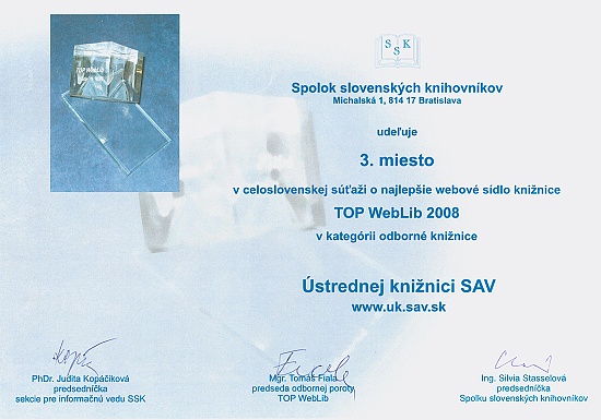 Ocenenie - 3. miesto v súťaži o najlepšie webové sídlo knižnice TOP WebLib 2008 v kategórii odborné knižnice prevzala od vyhlasovateľa súťaže - Spolku slovenských knihovníkov riaditeľka Ústrednej knižnice SAV Andrea Doktorová na knihovníckom kongrese INFOS 2009, ktorý bol v dňoch 27. - 30. apríla 2009 v Kongresovom centre SAV v Starej lesnej.