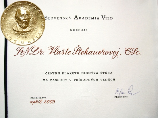 Predsedníctvo SAV udelilo pri príležitosti životného jubilea RNDr. Vlaste Štekauerovej, CSc. Čestnú plaketu Dionýza Štúra za zásluhy v prírodných vedách.