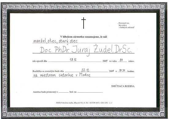 V piatok 18. decembra vo veku 80 rokov zomrel významný slovenský historický geograf a dlhoročný vedecký pracovník Geografického ústavu SAV doc. PhDr. Juraj Žudel, DrSc.