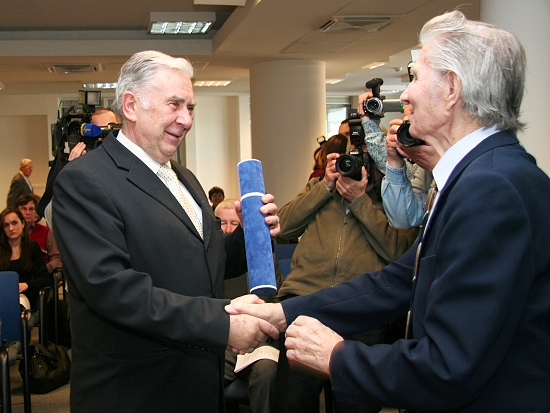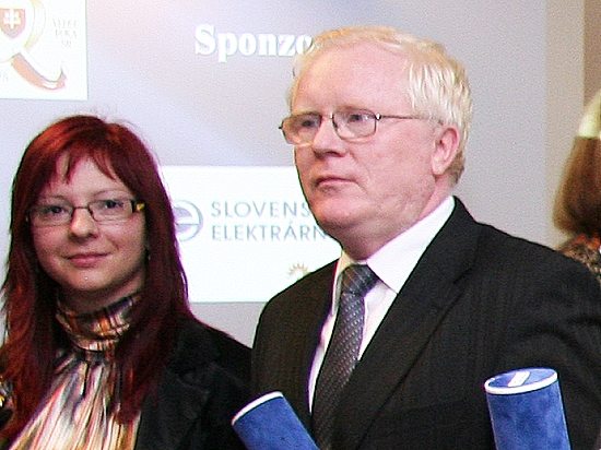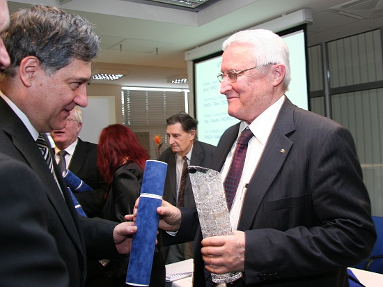 Ľubomír Lenoch spolu s tajomníkom Klubu vedecko-technických žurnalistov Martinom Kučekom ďakovný diplom za dlhoročnú spoluprácu odovzdali aj bývalému predsedovi SAV prof. Štefanovi Lubymu, ktorý bol členom riadiaceho výboru všetkých predchádzajúcich ročníkov súťaže Vedec roka.