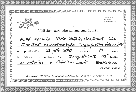Posledná rozlúčka s dlhoročnou vedeckou pracovníčkou Geografického ústavu SAV bude v utorok 3. augusta o 13.00 h na cintoríne v Slávičom údolí v Bratislave.