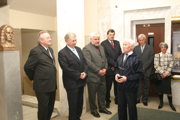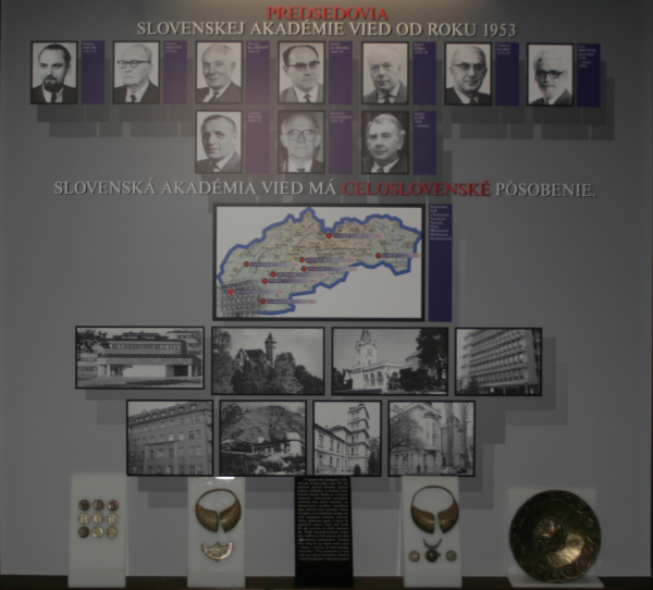 Pracovník Ústredného archívu SAV Jozef Kľačka podrobne oboznámil prítomných s obsahom dvoch nových reprezentačných vitrín vo vestibule Úradu SAV, ktoré ilustračnou formou približujú históriu a vývoj inštitucionalizovanej vedy na Slovensku.