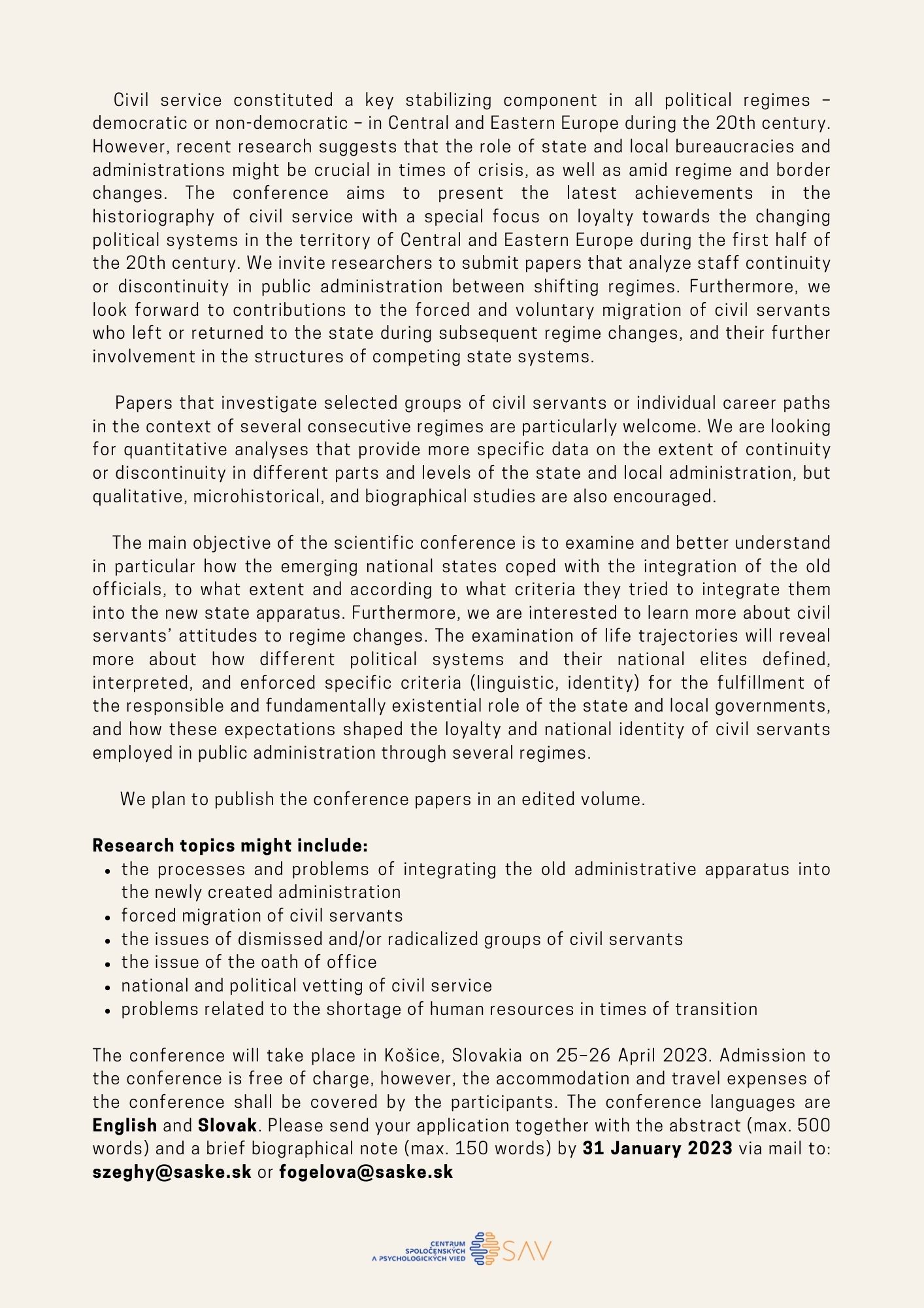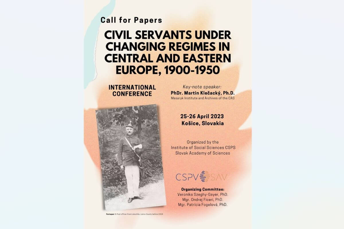 Institute of Social Sciences CSPV SAV, v. in. i., addresses interested parties with continuous operation for the international scientific conference Civil Servants under Changing Regimes in Central Europe and Eastern Europe, 1900-1950.