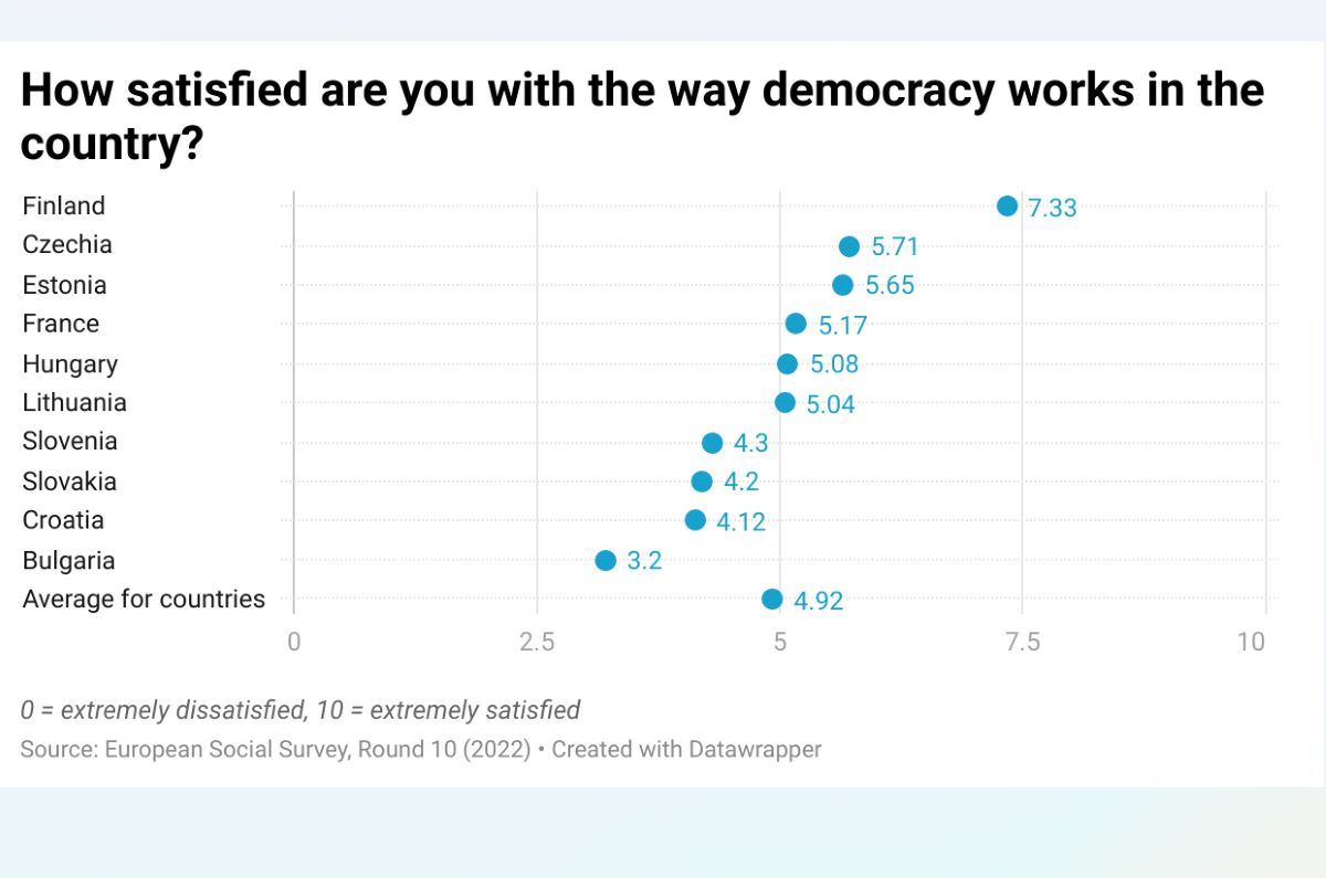 According to the latest data from the European Social Survey (ESS), 88% of people in Slovakia consider it important to live in a country that is democratically governed. This is reflected in the average country response to the question "How important is it for you to live in a democratically governed country", which is just below the average of the ten participating countries (see Figure 1). Statistically higher importance of democracy, compared to Slovaks, was expressed by Finns, Estonians and French, on the contrary, for Czech respondents it is less important. Slovak responses to the question "To what extent are you satisfied with the way democracy works in your country?" are, however, slightly more negative. The Slovaks are ranked third from the bottom, ahead of the Bulgarians and the Croatians (Figure 2).