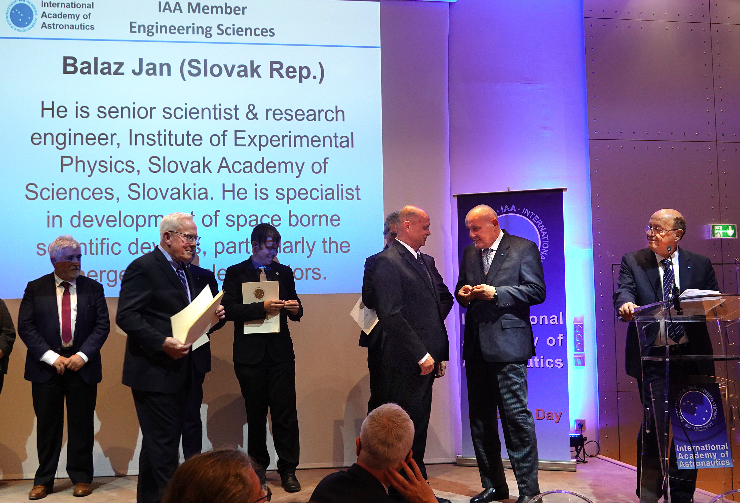 The induction ceremony of the new astronautics academics took place on September 17, 2022, at a gala dinner on the occasion of the International Astronautical Congress 2022 at the IAA headquarters in Paris. An academic day was held as part of the Congress, during which Slovakia was introduced to the world astronautics community as a future associate member of the European Space Agency ESA. The presentation of Slovakia to a number of invited foreign guests from the field of astronautics was provided by the Slovak Space Office at the Ministry of Education, Science, Research and Sport of the Slovak Republic in cooperation with the SARIO agency and the Slovak Embassy in France.