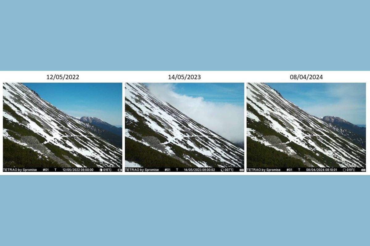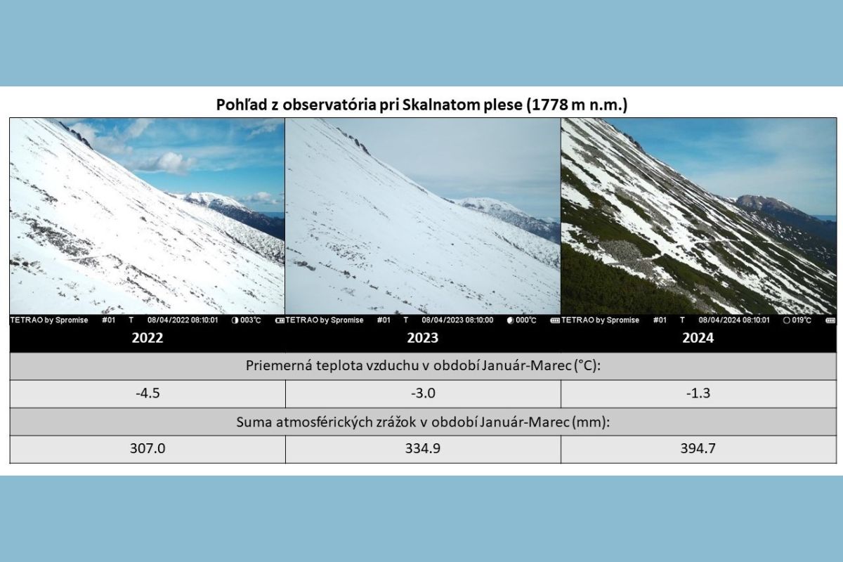 Scientific and technical experts of the Department of Atmospheric Physics of the detached workplace of the Earth Science Institute SAS in Stará Lesná have been documenting the condition of the snow cover on the southeastern slope of the High Tatras in the area of Skalnaté pleso for the third year using up-to-date methods. Compared to 2022 and 2023, in 2024, they saw a significant decrease in snow after the winter season due to higher temperatures, despite increased precipitation in the form of snow. The compared images taken by a static camera document the state of the snow cover on April 8 each year.
