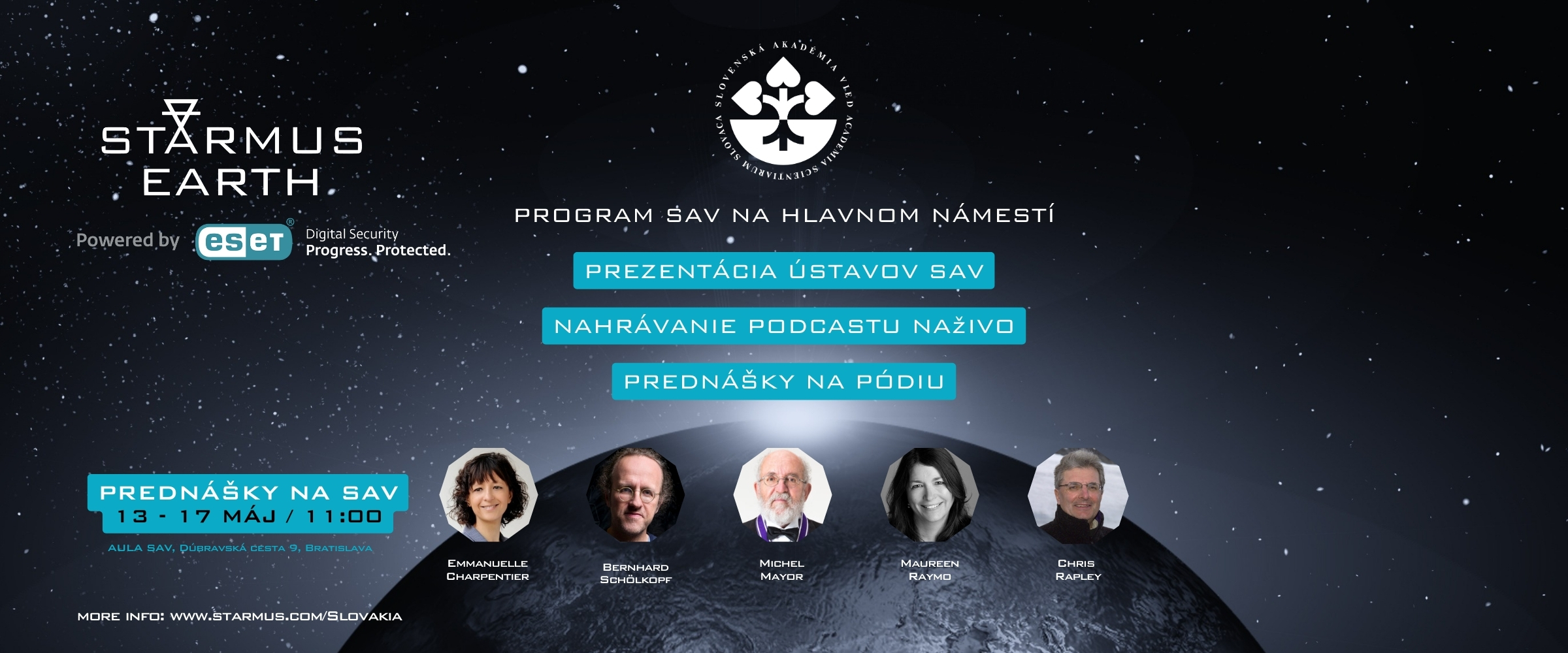 Gripping lectures by experts and researchers covering a number of fascinating topics from space exploration to environmental science will take place on academic grounds throughout the week as part of the STARMUS City program. During the festival, the Slovak Academy of Sciences will welcome five world's top scientific personalities to the main hall of the SAS on Dúbravská cesta in Bratislava.