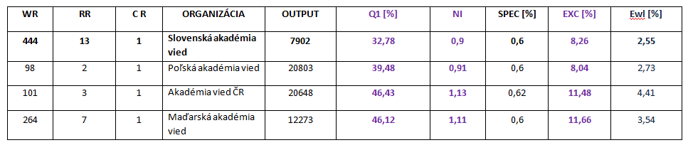 Pozitívnym javom je zlepšenie sa SAV v indikátoroch, ktoré sú nezávislé na veľkosti organizácie a ktoré poukazujú na vynikajúce výstupy a ich vplyv v rámci danej vedeckej oblasti (High Quality Publications Q1, Excellence Rate EXC, Normalized Impact NI).