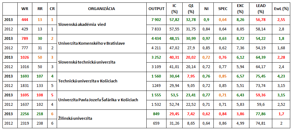 Do tohtoročného hodnotenia sa dostalo 6 slovenských vedecko-výskumných inštitúcií (uvedené nižšie v tabuľke), pričom napr. z Českej republiky ich bolo zaradených až 44 (Akadémia vied ČR bola hodnotená ako celok, ale samostatne bolo zaradených aj 18 organizácií, ktorých je zriaďovateľom).
