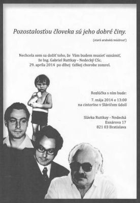 29. apríla 2014 nás náhle opustil Ing. Gabriel Ruttkay – Nedecký, CSc. po dlhej ťažkej chorobe.