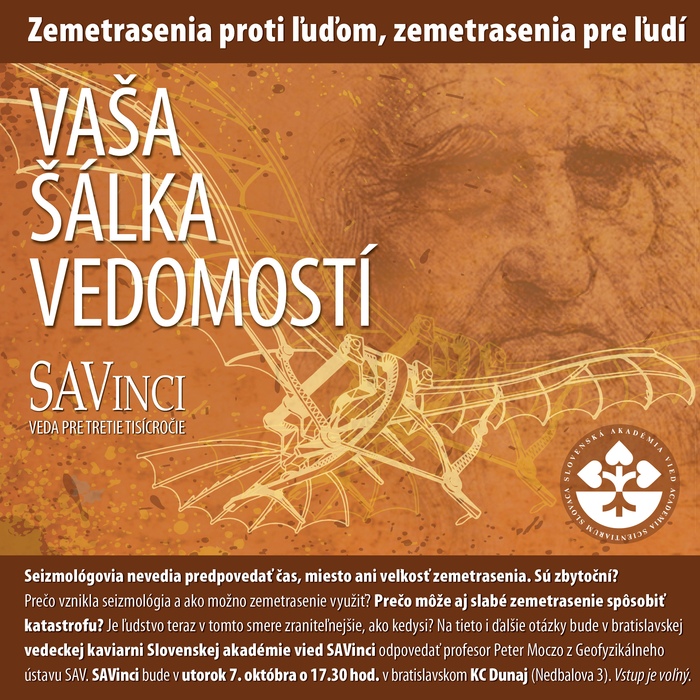 Téma Zemetrasenia proti ľuďom, zemetrasenia pre ľudí bude hlavným námetom októbrovej vedeckej kaviarne SAVinci. Hosťom bude profesor Peter Moczo z Geofyzikálneho ústavu SAV a Fakulty matematiky, fyziky a informatiky Univerzity Komenského v Bratislave.