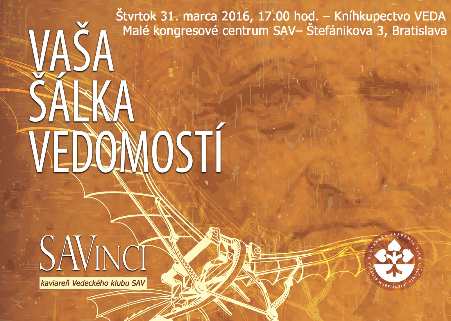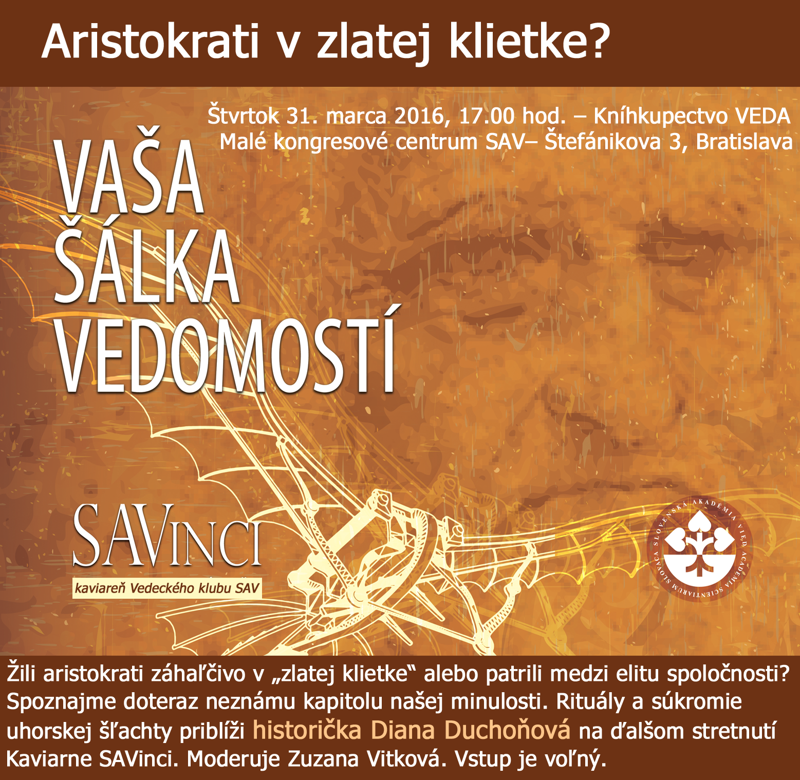 Žili aristokrati záhaľčivo v „zlatej klietke“ alebo patrili medzi elitu spoločnosti? Spoznajme doteraz neznámu kapitolu našej minulosti, ktorá vďaka ideologickému vnímaniu našich dejín dlho zostala zahalená tajomstvom a mýtmi. Rituály a súkromie uhorskej šľachty priblíži historička Diana Duchoňová na ďalšom stretnutí Kaviarne SAVinci. Kedy? Vo štvrtok 31. marca 2016 už o 17.00 hod. v Malom kongresovom centre SAV (Kníhkupectvo VEDA) – Štefánikova ul. č. 3 v Bratislave. Moderuje Zuzana Vitková. Vstup je voľný.