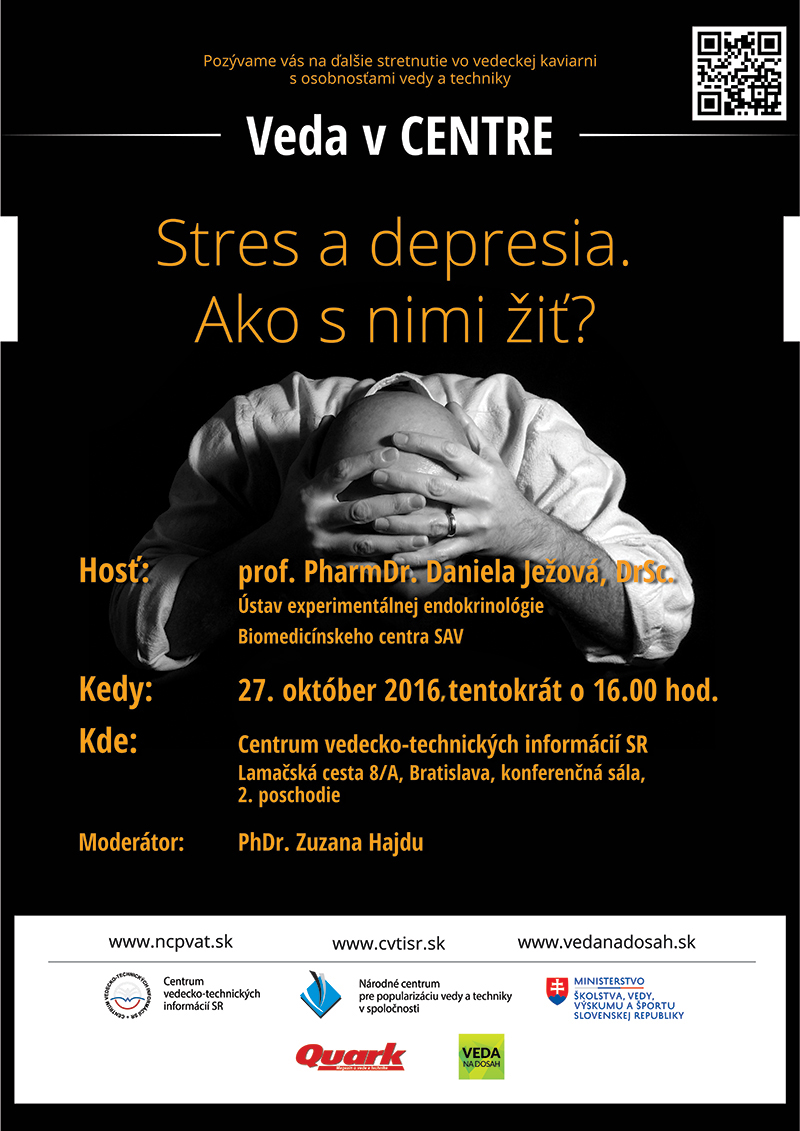 Vo štvrtok 27. 10. 2016, výnimočne o 16.00 hod. bude hosťom popularizačnej kaviarne Veda v CENTRE významná slovenská vedkyňa a uznávaná farmakologička prof. PharmDr. Daniela Ježová, DrSc., z Ústavu experimentálnej endokrinológie Biomedicínskeho centra SAV, ktorá je zároveň aj členkou predsedníctva SAV. Vo svojej prednáške sa bude venovať výskumu stresu, účinku psychotropných látok, mozgovej plasticite, fyziológii človeka a neuroendokrinným korelátom, či úzkosti a depresii.