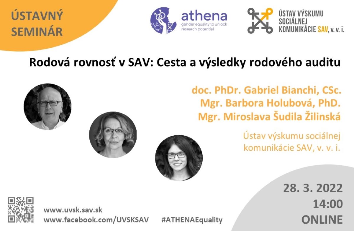 Ústav výskumu sociálnej komunikácie SAV, v. v. i., pozýva na ústavný seminár s názvom Rodová rovnosť v SAV: cesta a výsledky rodového auditu autorského kolektívu projektu H2020 Athena – G. Bianchi, B. Holubová, M. Šudila Žilinská. Seminár priblíži skúsenosti s prvým rokom prípravy Plánu rodovej rovnosti v SAV.