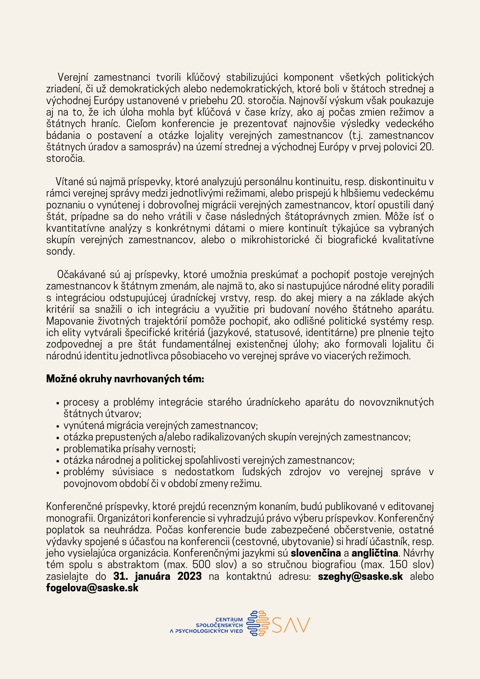 Spoločenskovedný ústav CSPV SAV, v. v. i., sa obracia na záujemcov s výzvou na podávanie prihlášok na medzinárodnú vedeckú konferenciu Verejní zamestnanci v meniacich sa režimoch na území strednej a východnej Európy 1900 – 1950.
