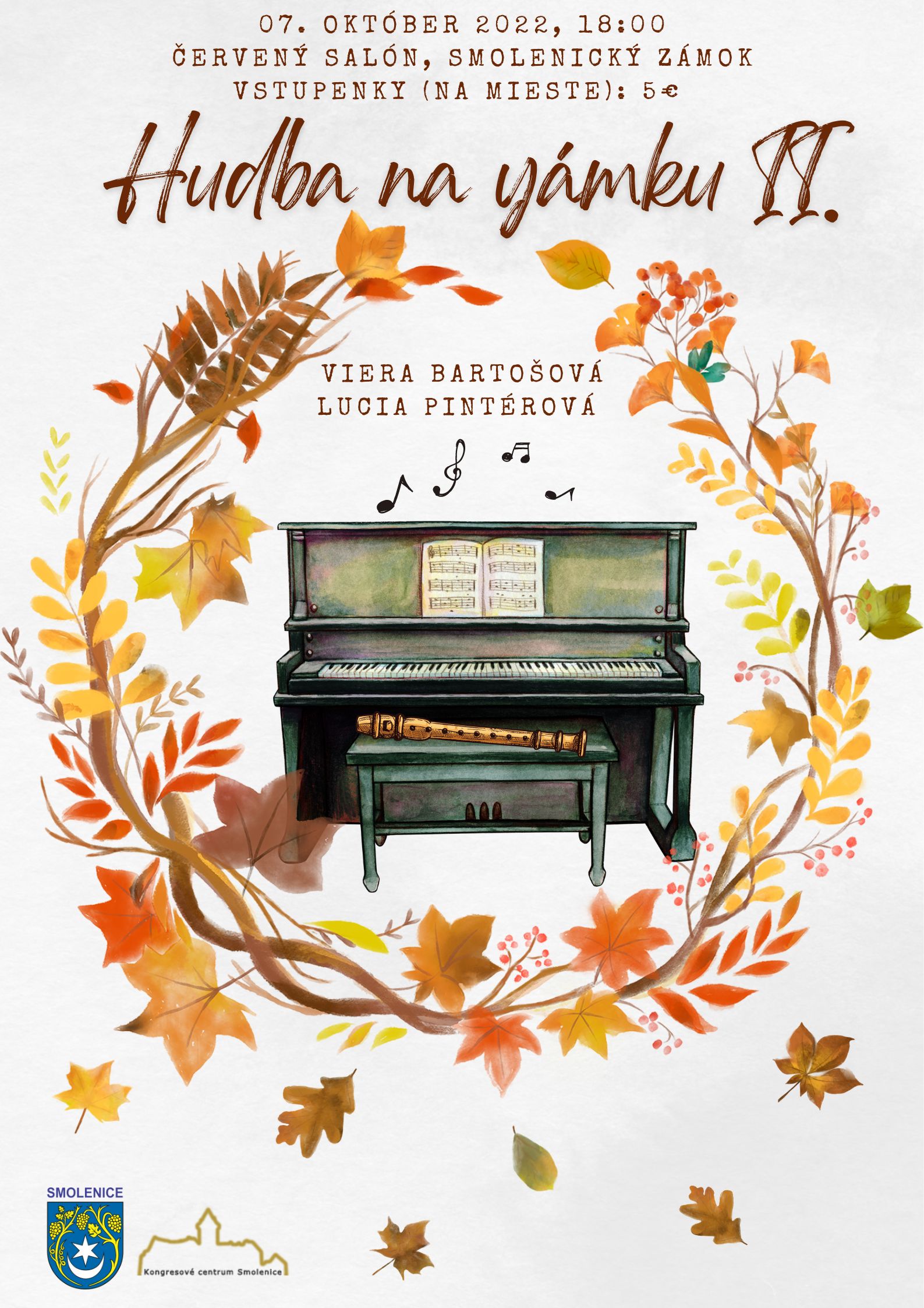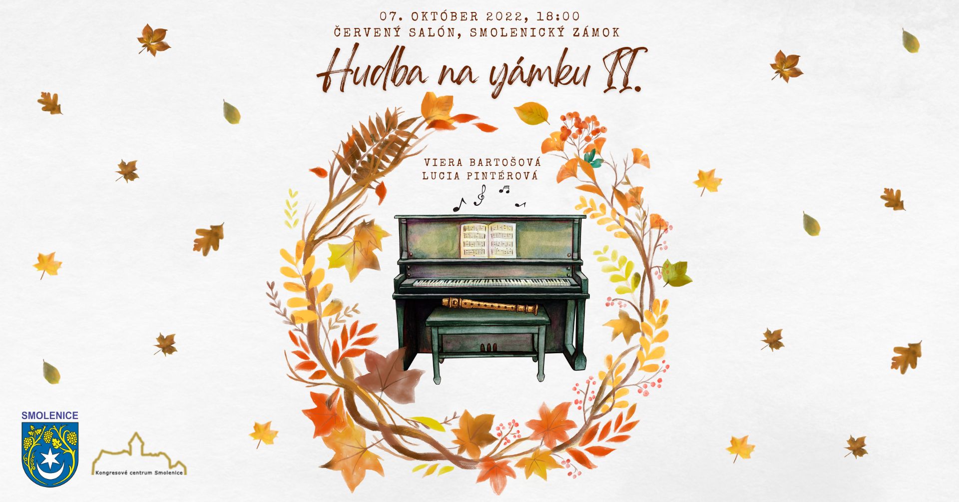 Kongresové centrum SAV Smolenice - Smolenický zámok Vás spoločne s obcou Smolenice srdečne pozývajú na v poradí už druhý koncert z cyklu Hudba na zámku, ktorý sa uskutoční dňa 7.10. 2022 o 18:00 v Červenom salóne Smolenickeho zámku. Po koncerte bude všetkých čakať malá recepcia v podobe dobrôt zo zámockej kuchyne ako aj ochutnávka medoviny od Včelca spod zámku. Koncert bude venovaný vybraným dielam klasickej hudby pre klavír a flautu od J. S. Bacha, cez E. H. Griega, C. Debussyho až po súčasného nórskeho skladateľa Sommerfeldta. Na koncerte sa predstaví flautistka Lucia Pintérová a klaviristka Viera Bartošová.