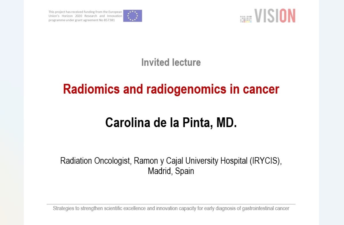 Biomedicínske centrum SAV, v. v. i., pozýva na prednášku Caroliny de la Pinta, MD., pod názvom "Radiomics and radiogenomics in cancer", ktorá sa koná v rámci aktivít organizovaných projektom VISION (Stratégie na posilnenie vedeckej excelentnosti a inovačnej kapacity pre včasnú diagnostiku nádorov tráviaceho traktu/Strategies to strengthen scientific excellence and innovation capacity for early diagnosis of gastrointestinal cancer).