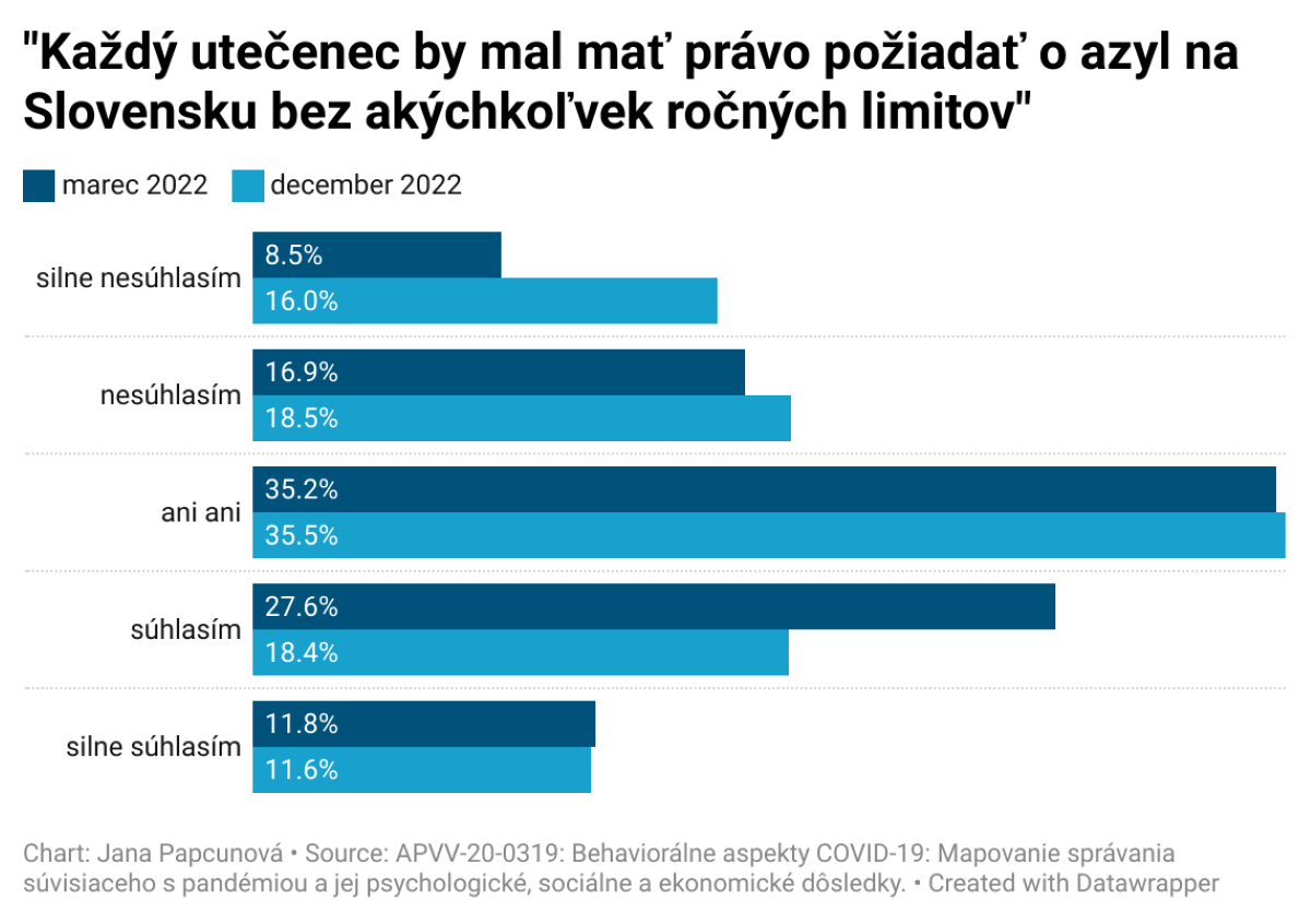 Takmer 35 percent opýtaných nesúhlasí (položky nesúhlasím a silne nesúhlasím), aby mali utečenci právo požiadať o azyl na Slovensku bez akýchkoľvek ročných limitov. Počet tých, ktorí s týmto silne nesúhlasí, narástol od marca do decembra takmer o polovicu.