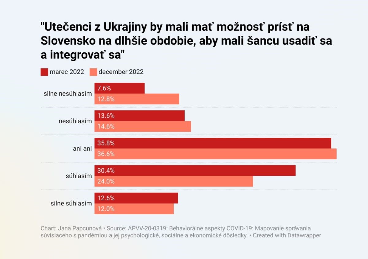 Spoločenskovedný ústav CSPV SAV, v. v. i., realizoval v roku 2022 dva prieskumy verejnej mienky týkajúce sa prijatia utečencov z Ukrajiny na reprezentatívnej vzorke obyvateľov Slovenka, na základe kvótnych charakteristík pre rod, vek, vzdelanie a kraj. Výsledky poukazujú na fakt, že podpora Slovákov a Sloveniek k prijatiu Ukrajincov mierne klesá, čo potvrdzujú dáta z marca a decembra 2022. Respondentov a respondentky sme v oboch mesiacoch oslovili s inštrukciou: Prosím, vyjadrite mieru vášho (ne)súhlasu s nasledujúcimi výrokmi týkajúcimi sa utečencov z Ukrajiny. (1 = silne nesúhlasím, 2 = nesúhlasím, 3= ani súhlasím/ani nesúhlasím, 4=súhlasím, 5= silne súhlasím).