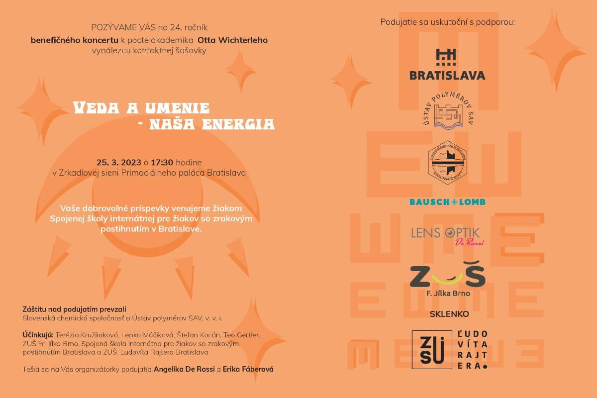 Slovenská chemická spoločnosť a Ústav polymérov SAV, v. v. i., srdečne pozývajú na 24. ročník benefičného koncertu k pocte akademika Otta Wichterleho, vynálezcu kontaktnej šošovky. Koncert sa uskutoční 25. marca 2023 o 17.30 hod. v Zrkadlovej sieni Primaciálneho paláca v Bratislave.