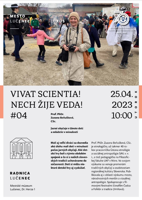 Slovenská akadémia vied Vás pozýva do Lučenca na štvrtú popularizačnú prednášku cyklu Vivat Scientia!/Nech žije veda! V utorok 25. apríla 2023 o 17.00 hod. sa v priestoroch Radnice Mestského múzea predstaví profesorka Zuzana Beňušková z Ústavu etnológie a sociálnej antropológie SAV, v. v. i., ktorá bude hovoriť na tému: Jarné sviatky a obyčaje – prečo nie sú všade rovnaké?