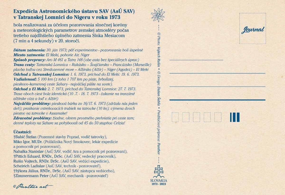 Na výstave sa návštevníci vrátia do 1. júna 1973, keď sa osemčlenná Expedícia Astronomického ústavu SAV z Tatranskej Lomnice vybrala pozorovať slnečnú korónu a intramerkuriálne planéty do Nigeru, osady El Meki v pohorí Aïr. Astronomické pozorovania sa robili fotograficky šiestimi ďalekohľadmi počas úplného zatmenia Slnka 30. júna 1973. Bolo to tretie najdlhšie zatmenie v 20. storočí s trvaním sedem minút a tri sekundy. Na pozorovacom mieste expedície v El Meki zatmenie trvalo 6 minút a 42 sekúnd. „Na miesto zatmenia sa cestovalo dvoma autami – Tatrou 148 a terénnym vozidlom ARO M461 po najväčšej púšti na svete Sahare a v najteplejších mesiacoch roka, júni a júli,“ približuje autor výstavy Vojtech Rušin z Astronomického ústavu SAV, v. v. i. Stručný, denný priebeh a zážitky z tejto náročnej cesty sú zobrazené na dvadsiatich paneloch s rozmermi 100x70 centimetrov a na 143 obrázkoch. Okrem získania vedeckých poznatkov bola táto cesta Saharou významná aj preto, že podnietila a rozšírila pozorovania slnečnej koróny v Československu a bola prvou zdokumentovanou cestou Slovákov cez Saharu.