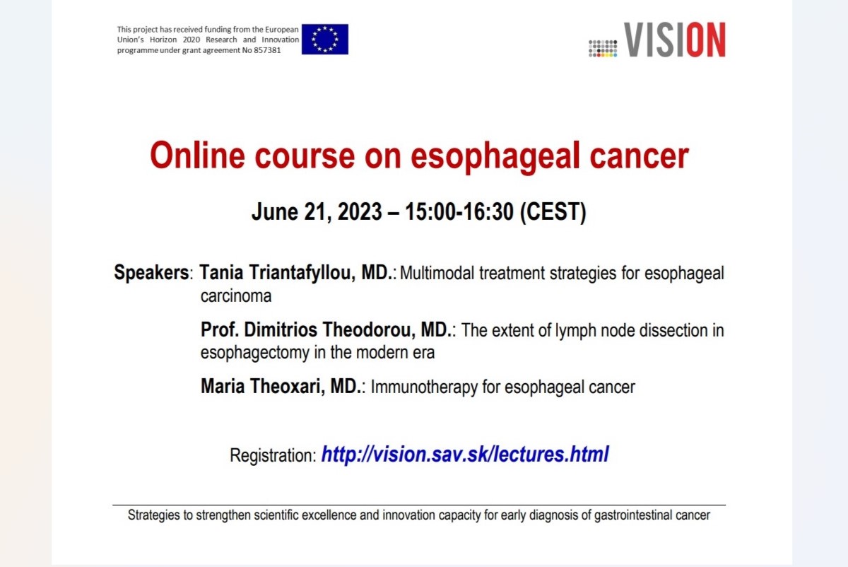 Biomedicínske centrum SAV, v. v. i., pozýva na kurz pod názvom „Esophageal cancer“, ktorý sa koná v rámci aktivít organizovaných projektom VISION (Stratégie na posilnenie vedeckej excelentnosti a inovačnej kapacity pre včasnú diagnostiku nádorov tráviaceho traktu/Strategies to strengthen scientific excellence and innovation capacity for early diagnosis of gastrointestinal cancer).