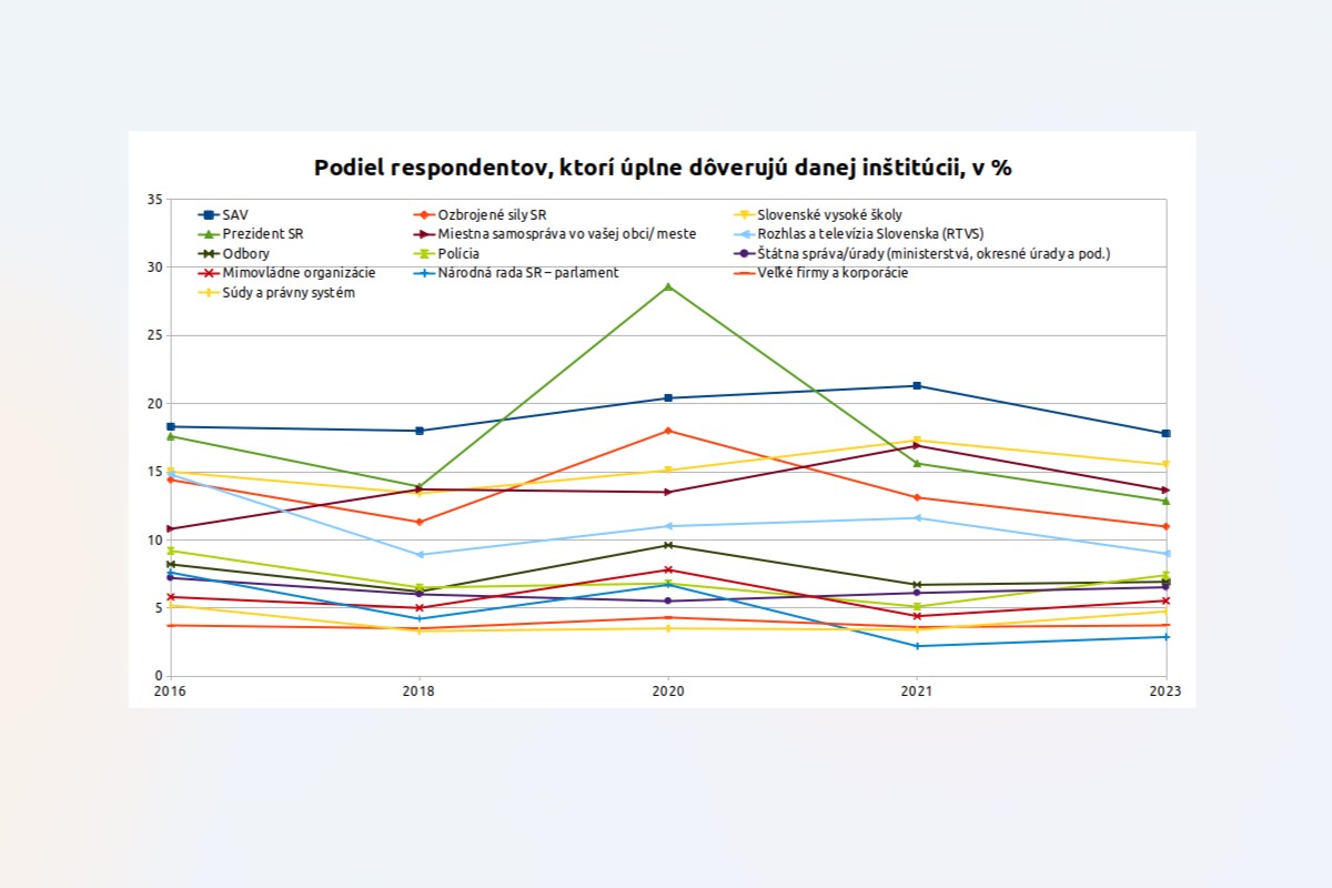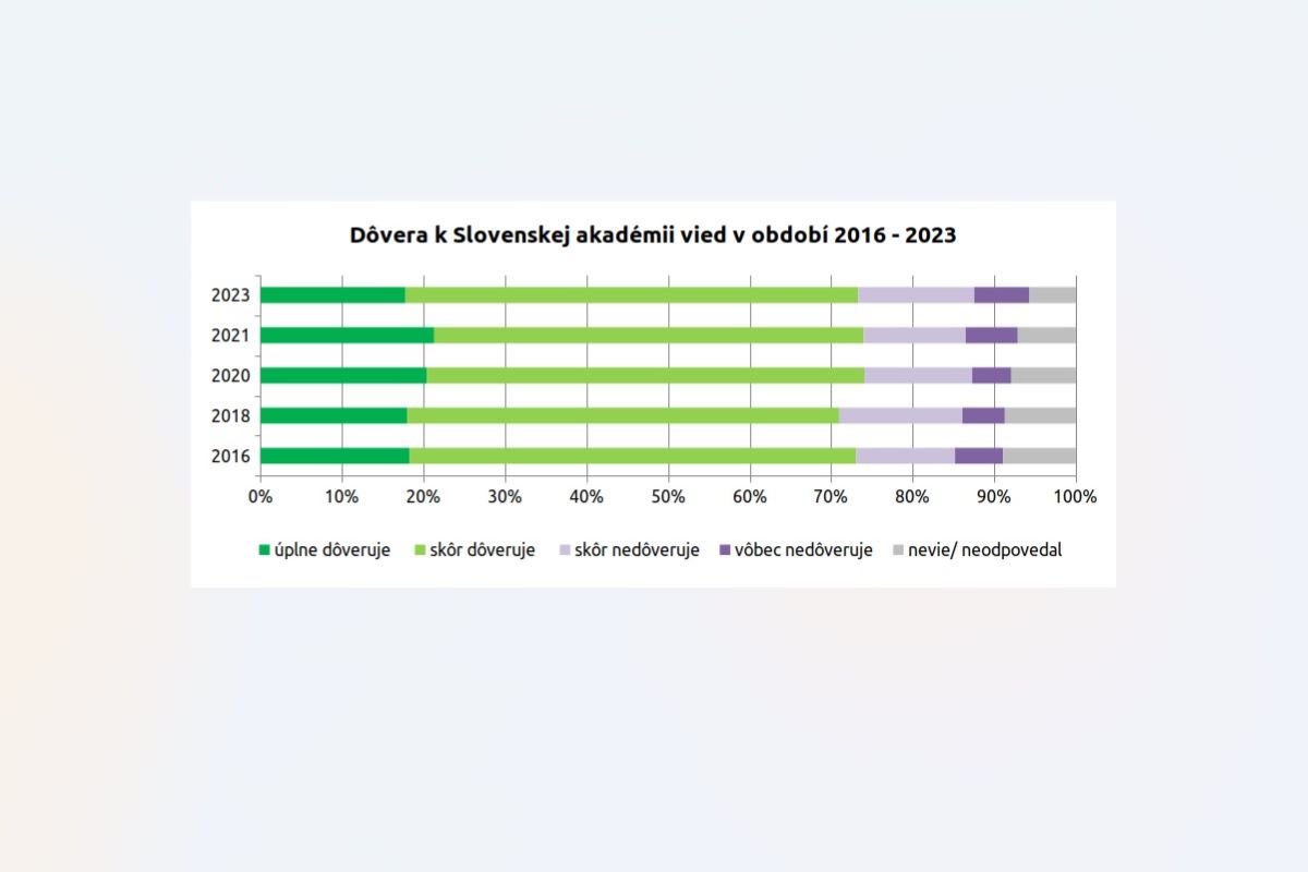 Výsledok merania dôveryhodnosti inštitúcií z konca mája 2023 opäť potvrdil pozíciu Slovenskej akadémie vied (SAV) ako najdôveryhodnejšej spomedzi štrnástich porovnávaných inštitúcií na Slovensku. Podľa prieskumu agentúry FOCUS Slovenskej akadémii vied úplne alebo skôr dôveruje 73,3 percenta respondentov. Dôvera k SAV je stabilne vysoká naprieč slovenskou spoločnosťou – je vysoká medzi všetkými vekovými kategóriami a je nezávislá od vzdelania alebo príjmu respondentov. Prieskum sa uskutočnil od 24. do 31. mája 2023 na vzorke 1012 respondentov.