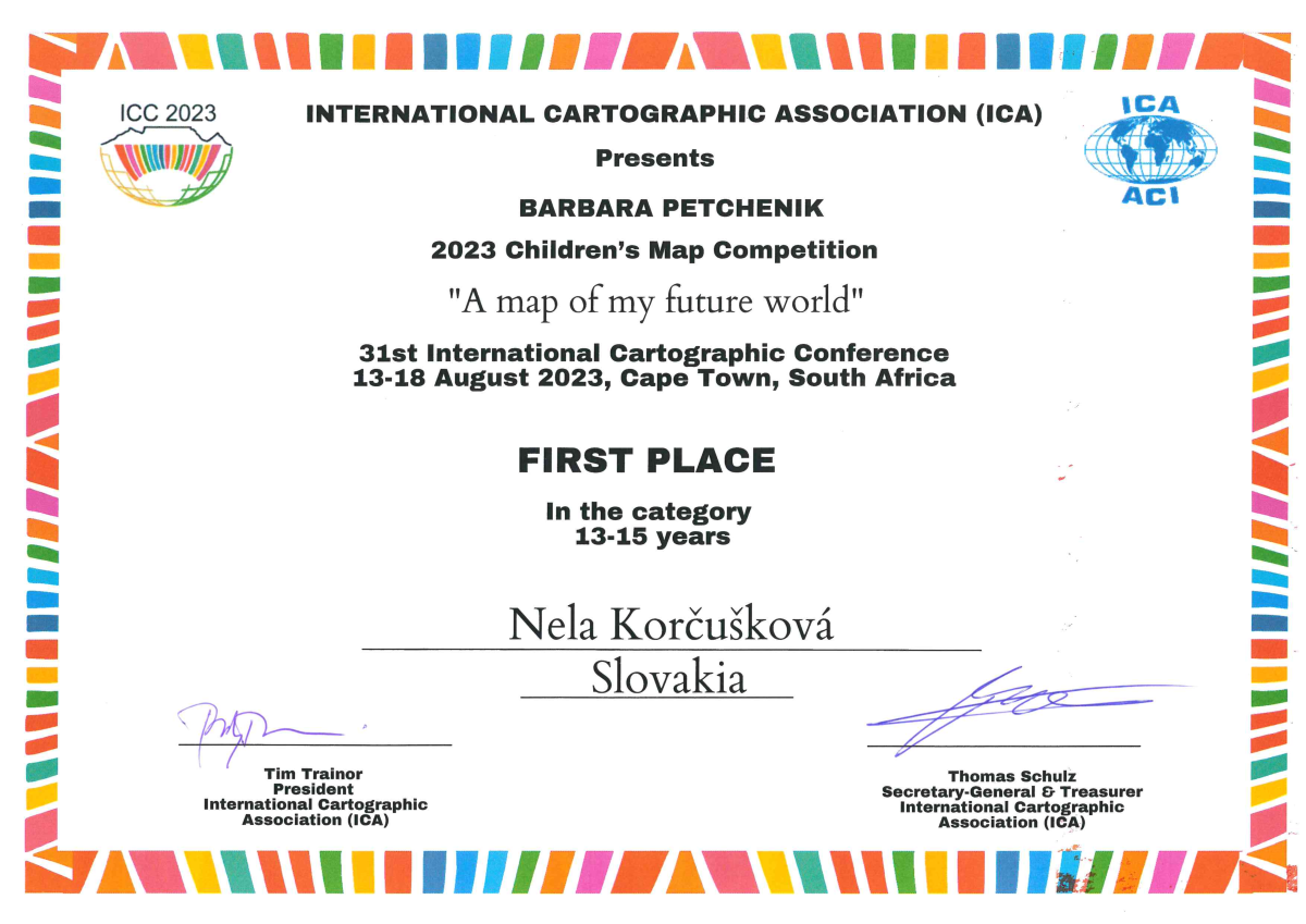 Práca 14-ročnej Nely Korčuškovej s názvom „Fragile Like Bubbles“ zvíťazila v rámci súťaže „Barbara Petchenik Children’s World Map Competition 2023“, ktorú vyhodnocovali počas 31. medzinárodnej kartografickej konferencie organizovanej Medzinárodnou kartografickou asociáciou (ICA) v Kapskom Meste v Južnej Afrike. Tento významný úspech dosiahla mladá talentovaná umelkyňa zo Základnej školy Pavla Országha Hviezdoslava v Trstenej v najsilnejšie obsadenej vekovej kategórii od 12 do 15 rokov.