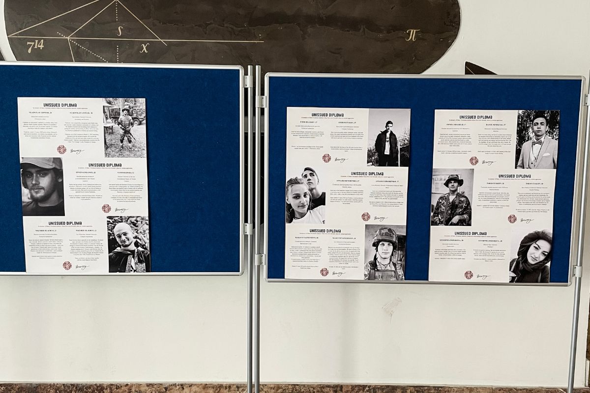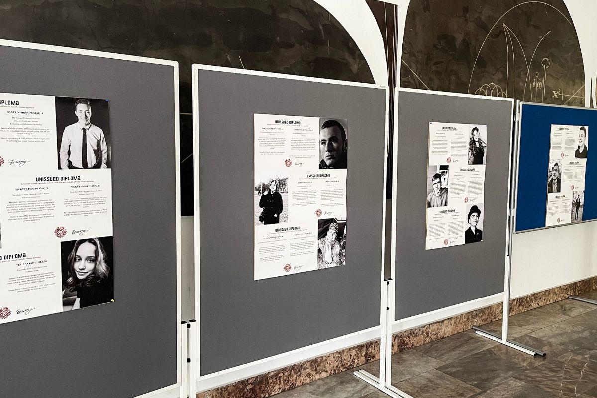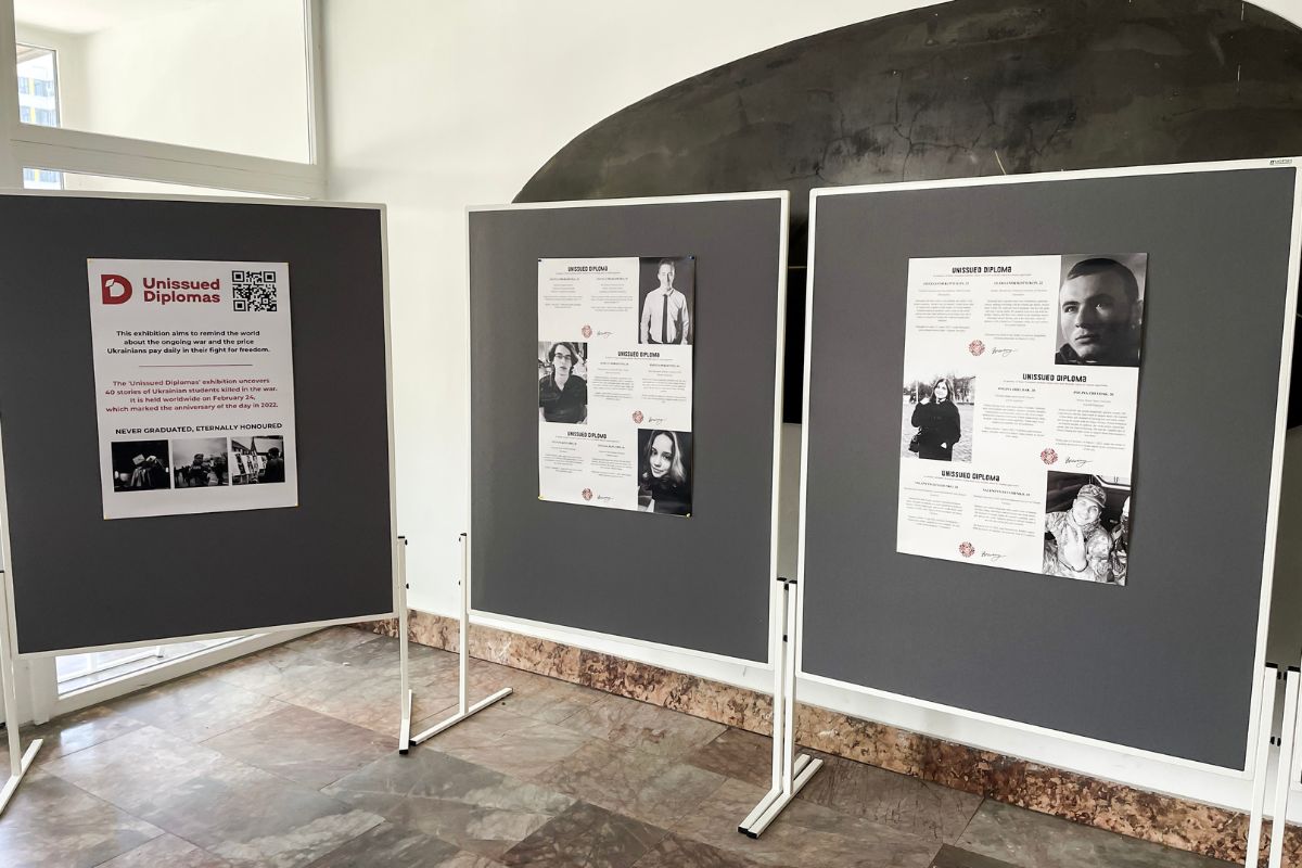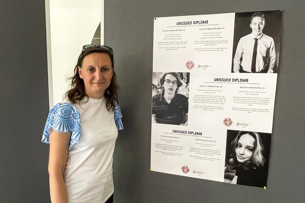 „Výstava Neodovzdané diplomy si uctieva pamiatku ukrajinských študentov, ktorí si svoje diplomy nikdy neprevezmú, lebo ich životy ukončila ruská invázia,“ hovorí Dr. Elena Lykhota, ktorá je spolu s Nedeľnou ukrajinskou školou v Bratislave a Slovenkou akadémiou vied spoluorganizátorkou výstavy.