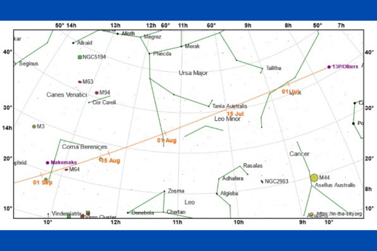 Letnú nočnú oblohu začala zdobiť kométa 13P/Olbers. Nadšenci sledovania hviezdneho neba ju zo Slovenska môžu vďaka jej jasnosti na úrovni 7,5 magnitúda pozorovať počas celej noci aj malými ďalekohľadmi.