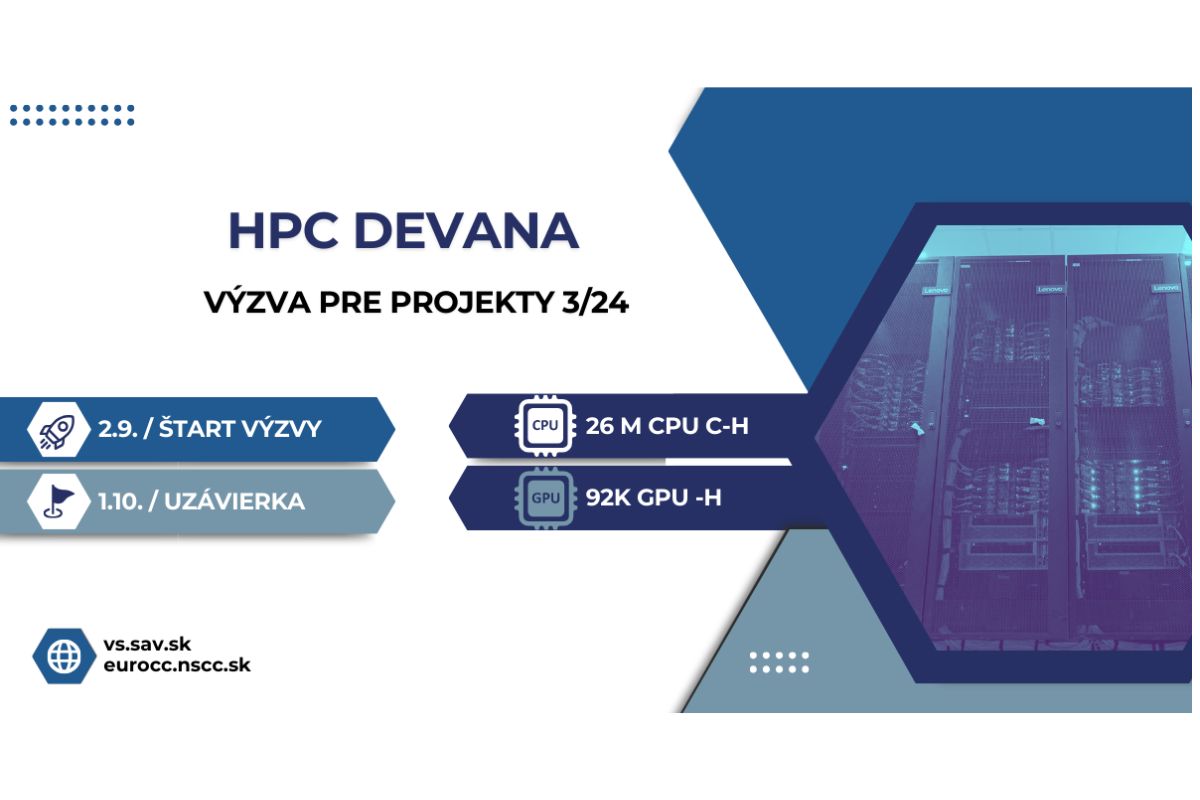 Výpočtové stredisko CSČ SAV, v. v. i., a Národné superpočítačové centrum otvarujú druhú tohtoročnú Výzvu na podávanie projektov pre štandardný prístup k HPC 3/24. Projekty možno podávať kontinuálne, pričom počas roka sú štandardne tri termíny uzávierky, po ktorej sa uskutoční hodnotenie dovtedy podaných žiadostí. O prístup je možné požiadať výhradne prostredníctvom používateľského portálu register.nscc.sk.