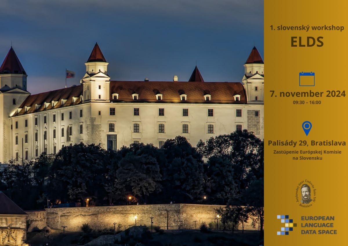 V priestoroch Zastúpenia Európskej komisie na Slovensku (Palisády 29, Bratislava) sa 7. novembra 2024 uskutoční 1. slovenský workshop ELDS – European Language Data Space. Do projektu s rovnomenným názvom European Language Data Space sa zapojilo Slovensko v zastúpení Jazykovedného ústavu Ľudovíta Štúra SAV, v. v. i., v spolupráci so slovenskými štátnymi orgánmi – Ministerstvom kultúry SR a Ministerstvom investícií, regionálneho rozvoja a informatizácie SR v roku 2023. Organizátorom workshopu je Jazykovedný ústav Ľ. Štúra SAV, v. v. i.