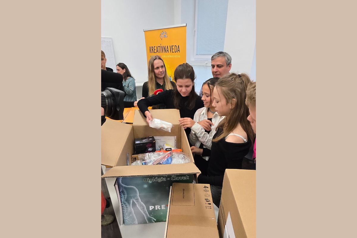 V rámci Týždňa vedy a techniky 2024 odovzdali v stredu 13. novembra symbolicky zástupcovia ústavov SAV žiakom a žiačkam Základnej školy na Sibírskej ulici 39 v Bratislave kreatívne sety na výučbu fyziky, technickej výuky, biológie a chémie.