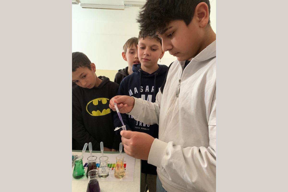 Už od rána sa uskutočnili viaceré hodinové interaktívne workshopy pre všetky triedy 2. stupňa ZŠ, od piatakov až po deviatakov. Aj deti, ktoré ešte nemajú v učebných plánoch chémiu, sa zoznámili s touto vednou oblasťou pomocou jednoduchých experimentov, ktoré si mohli sami vyskúšať. Vizuálne atraktívne a navyše jednoduché experimenty s deťmi môžu zopakovať aj pani učiteľky, ktoré dostali detailné postupy na ich prípravu. „Deti tak videli najbežnejšie pokusy ako slonia pasta, sopka či parný rušeň alebo farebné plameňové skúšky solí rôznych kovov. Pochopili, prečo sú kolové nápoje kyslé a ako im v určovaní kyslosti môže pomôcť červená kapusta,“ približuje Lenka Lorencová. Starší účastníci mohli naviac vidieť ako sa izoluje DNA, alebo si mohli vyskúšať premeniť meď na striebro.