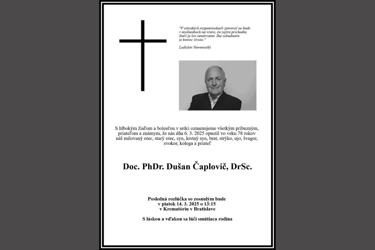 S hlbokým zármutkom sme prijali správu, že vo štvrtok 6. marca 2025 vo veku 78 rokov nás navždy opustil náš kolega a priateľ, významný archeológ doc. PhDr. Dušan Čaplovič, DrSc. Posledná rozlúčka so zosnulým bude v piatok 14. marca 2025 o 13.15 hod. v bratislavskom krematóriu.