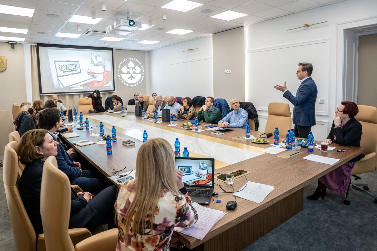 Na pôde akadémie delegáciu privítal člen Predsedníctva SAV a zástupca podpredsedníčky SAV pre zahraničné styky Dr. Tomáš Hromádka, ktorý hosťom predstavil SAV, štruktúru, spôsob financovania, vedecký potenciál, informoval ich o jednotlivých oddeleniach vied a inštitútoch akadémie.