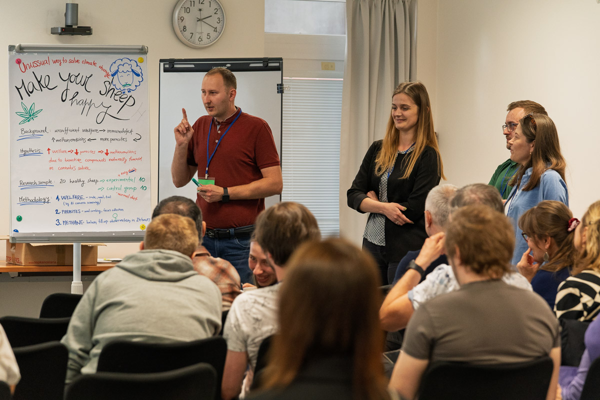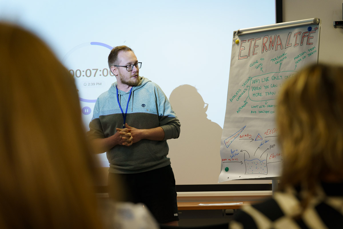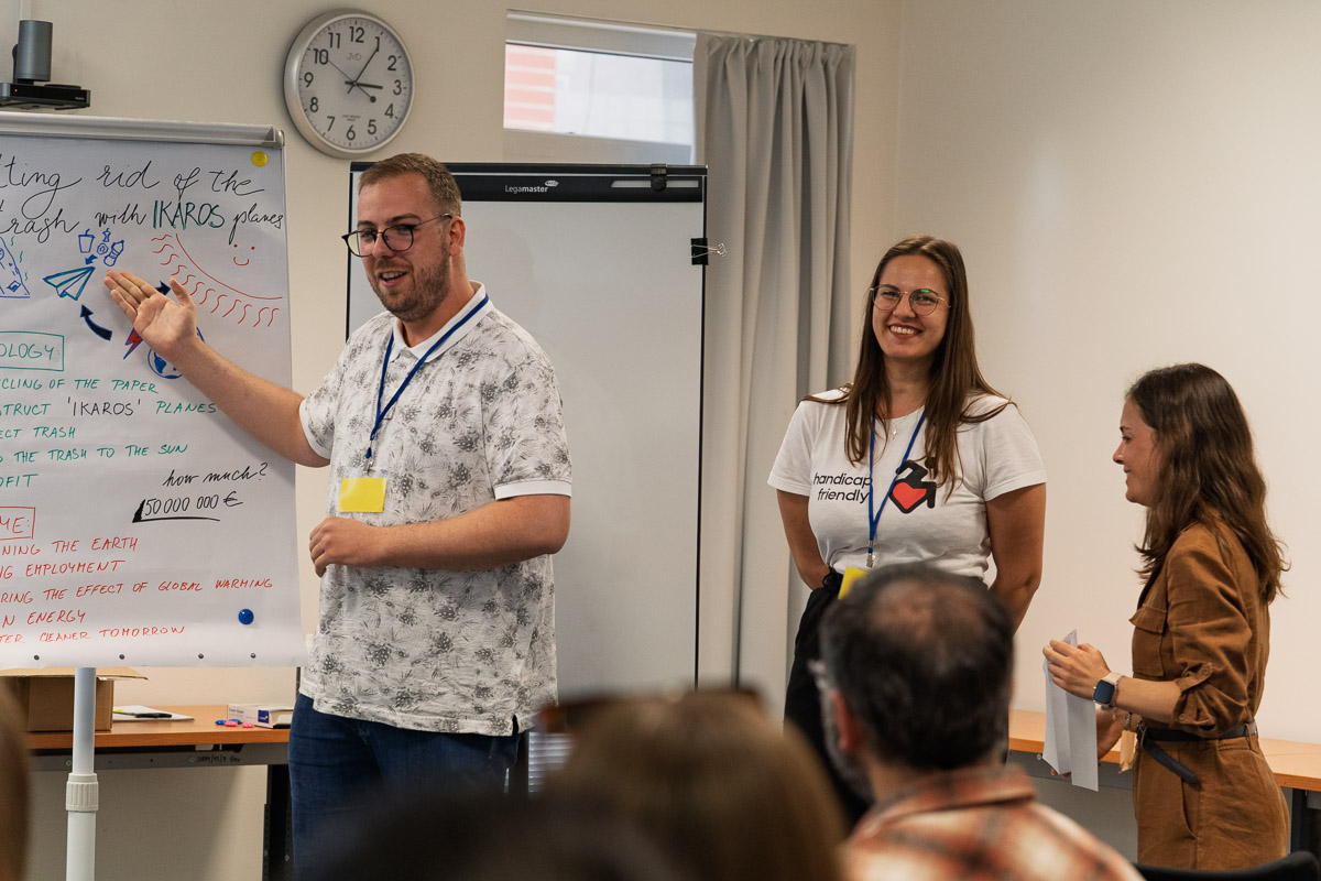 Po spoločnom obede sa účastníčky a účastníci rozdelili do pracovných skupín, ktoré mali za úlohu vytvoriť interdisciplinárny návrh projektu so zohľadnením dopadu, realizovateľnosti a udržateľnosti. Popoludnie začalo úvodom Martina Venharta, novozvoleného predsedu Slovenskej akadémie vied, ktorý sa krátko predstavil, predstavil svoju víziu a priority. Následne nasledovali prezentácie projektových návrhov a odborné pripomienky od Tomáša Hromádku, Ľubice Lacinovej, Denisy Fedákovej a Alexandry Kovalčíkovej, ktorí a ktoré vyzdvihli originalitu a interdisciplinárny charakter predstavených myšlienok. Návrhy ukázali nielen vedecké ambície, ale aj pozoruhodný zmysel pre humor a kreativitu – čo potvrdzuje silný potenciál spolupráce medzi začínajúcimi vedkyňami a vedcami.