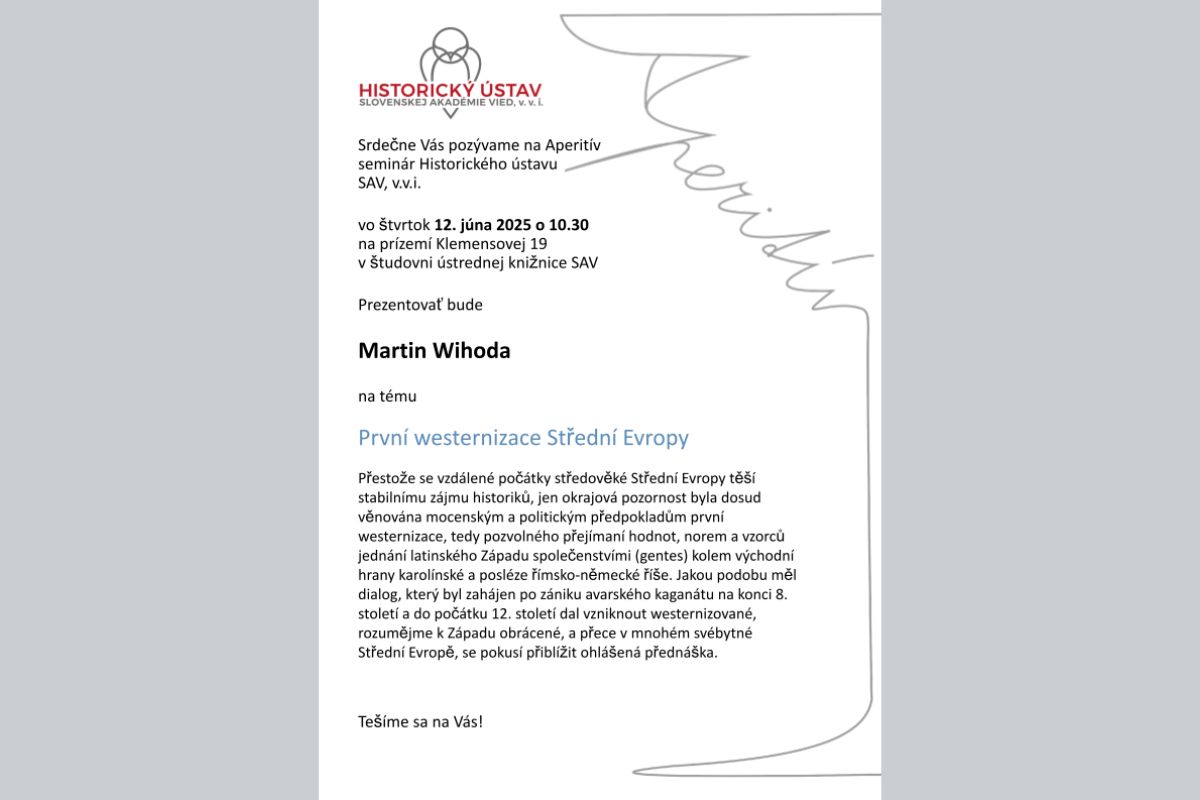 S blížiacim sa letom Historický ústav SAV, v. v. i., srdečne pozýva na poslednú prednášku zo seminárneho cyklu Aperitív Historického ústavu SAV. Uskutoční sa tento štvrtok 12. júna 2025 o 10.30 hod. v študovni Ústrednej knižnice SAV (Klemensova 19, Bratislava) na prízemí.
