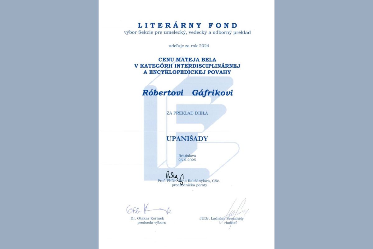 Komparatista Róbert Gáfrik, riaditeľ Ústavu svetovej literatúry SAV, v. v. i., získal za jedinečný preklad staroindických Upanišad zo sanskrtského originálu do slovenčiny Cenu Mateja Bela za rok 2024. Cenu, ktorá je prejavom verejného uznania za preklad vedeckého alebo odborného diela, udeľuje výbor Sekcie pre vedecký a odborný preklad Literárneho fondu.