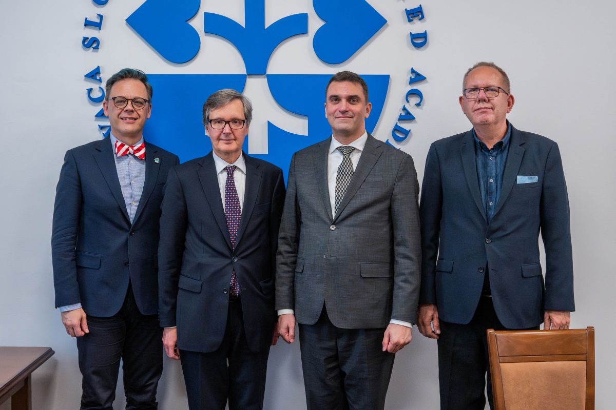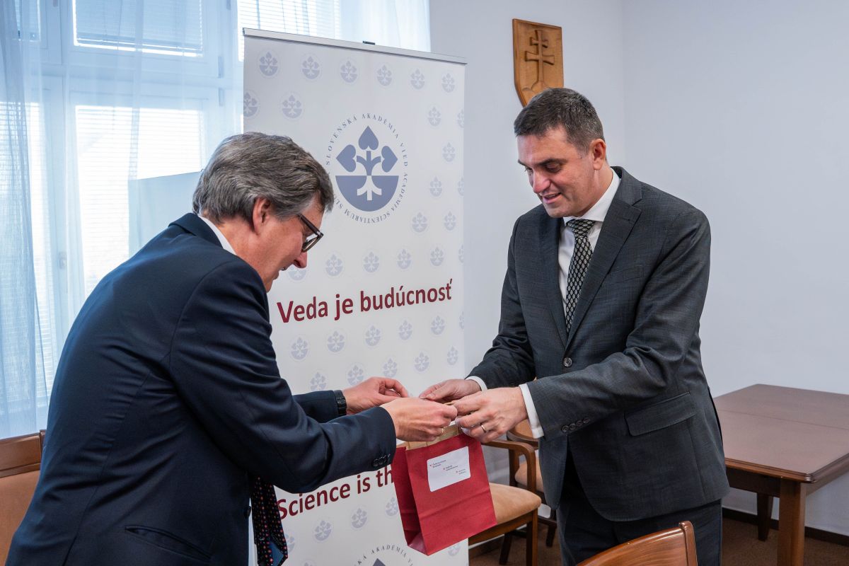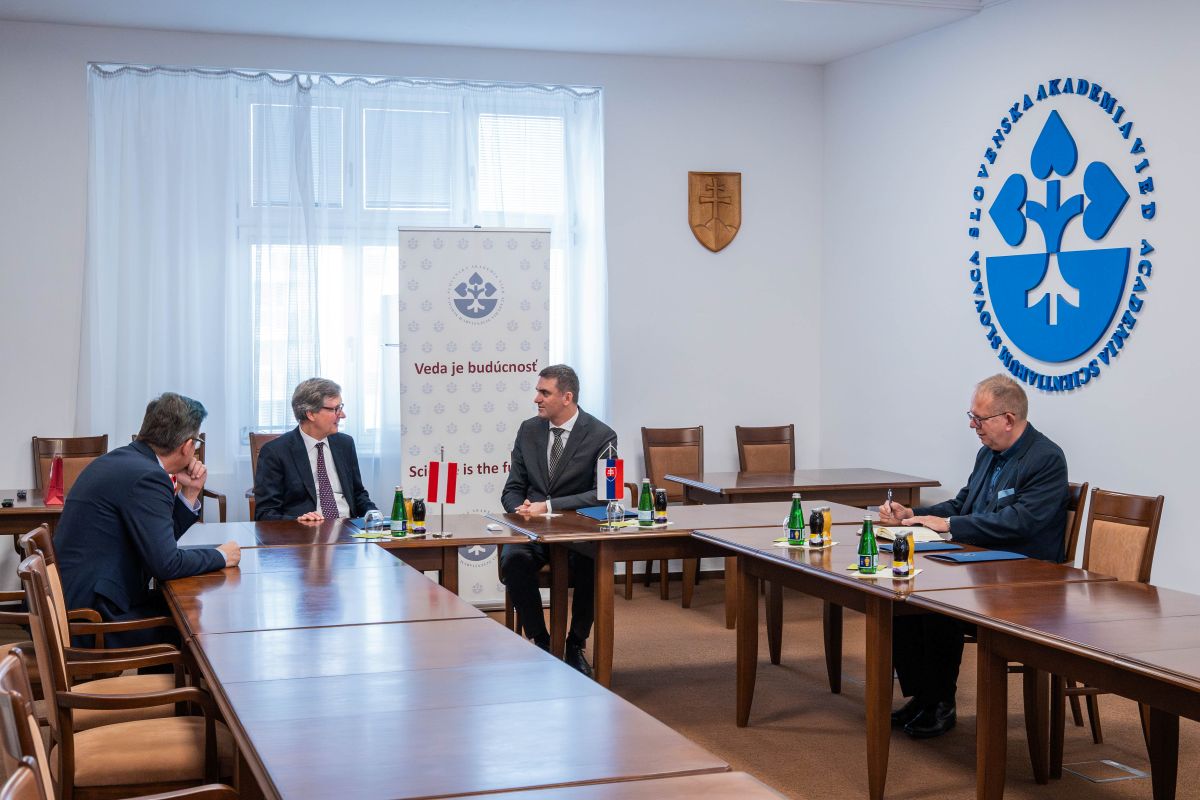 Predseda SAV Dr. Martin Venhart prijal v pondelok 20. októbra 2025 na pôde SAV mimoriadneho a splnomocneného veľvyslanca Rakúskej republiky na Slovensku Dr. Johannesa Wimmera. Na stretnutí sa zúčastnili aj podpredseda SAV pre vedu, výskum a inovácie Dr. Tomáš Hromádka a zástupca Odboru medzinárodnej spolupráce Úradu SAV Dr. František Fundárek.