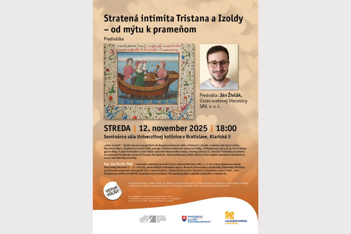 Ak chcete vedieť, ako to bolo s láskou Tristana a Izoldy, Ústav svetovej literatúry SAV, v. v. i., vás pozýva na verejnú prednášku Jána Živčáka. O podobách tohto mýtu vo francúzskych románoch z druhej polovice 12. storočia bude hovoriť v rámci série Čo všetko je svetová literatúra?, ktorú ústav organizuje v spolupráci s Univerzitnou knižnicou v Bratislave. Podujatie sa koná v stredu 12. novembra 2025 o 18.00 hod. v Seminárnej sále Univerzitnej knižnice Bratislava na Klariskej 5.