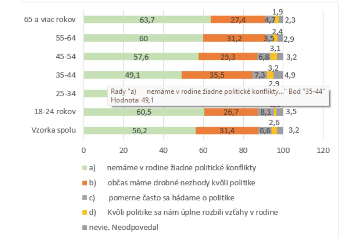 Odpovede na otázku Do akej miery existujú politické konflikty v rámci Vašej najužšej rodiny? ukazujú na prevažujúci názor vo všetkých vekových skupinách, že v rodine pre politiku neexistujú žiadne konflikty. „Tento názor je však najrozšírenejší medzi najmladšími a najstaršími respondentami. Okrem najmladšej vekovej skupiny v ostatných vidieť nárast tohto názoru v súvislosti s rastúcim vekom. O častých hádkach o politike v rodinách hovorí len veľmi malá časť oslovených, najviac ľudia vo veku 24 až 35 rokov, u ktorých sa dá predpokladať, že vstupujú do aktívneho pracovného procesu a verejného života, teda aj najcitlivejšie vnímajú aj širšie spoločenské problémy,“ vysvetľuje Miroslav Tížik zo Sociologického ústavu SAV, v. v. i.