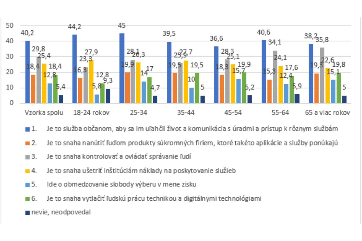 Pri otázke o dôvodoch zavádzania digitálnych technológií bola najčastejšou odpoveďou vo všetkých skupinách možnosť, že ide o službu občanom na uľahčenie života a komunikácie s úradmi. „Pri možnosti ´je to snaha kontrolovať a ovládať správanie ľudí´, ktorá bola druhou najčastejšou odpoveďou v rámci celej opýtanej vzorky, sa preukázala väčšia miera presvedčenia o tomto dôvode zavádzania digitálnych technológií v dvoch starších vekových skupinách respondentov, čo môže svedčiť o zvýšenej nedôvere voči týmto technológiám v daných vekových skupinách,“ osvetľuje Elena Klátiková.